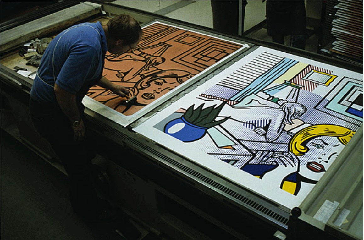 John Hutcheson using a brayer to ink the woodblock on the lithography offset press bed for the black print run of Roy Lichtenstein’s color relief print Roommates, Tyler Graphics Ltd. workshop, Mount Kisco, New York, 1994. Photograph by Marabeth Cohen-Tyler.