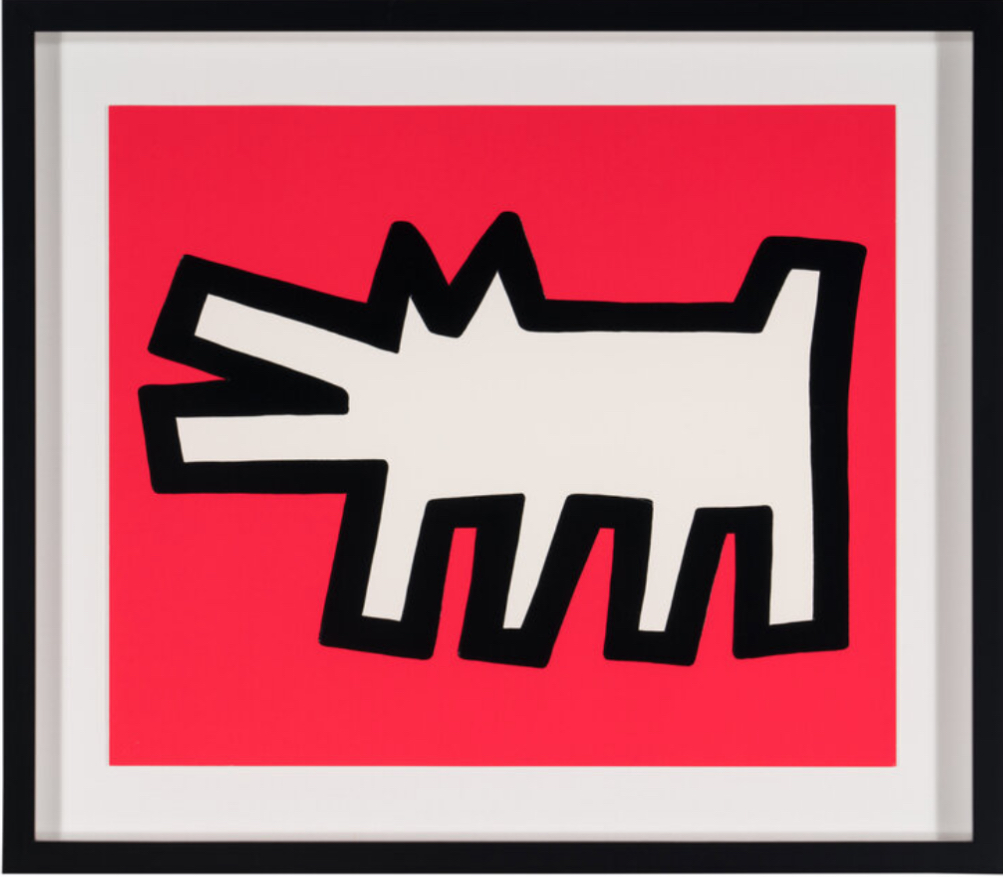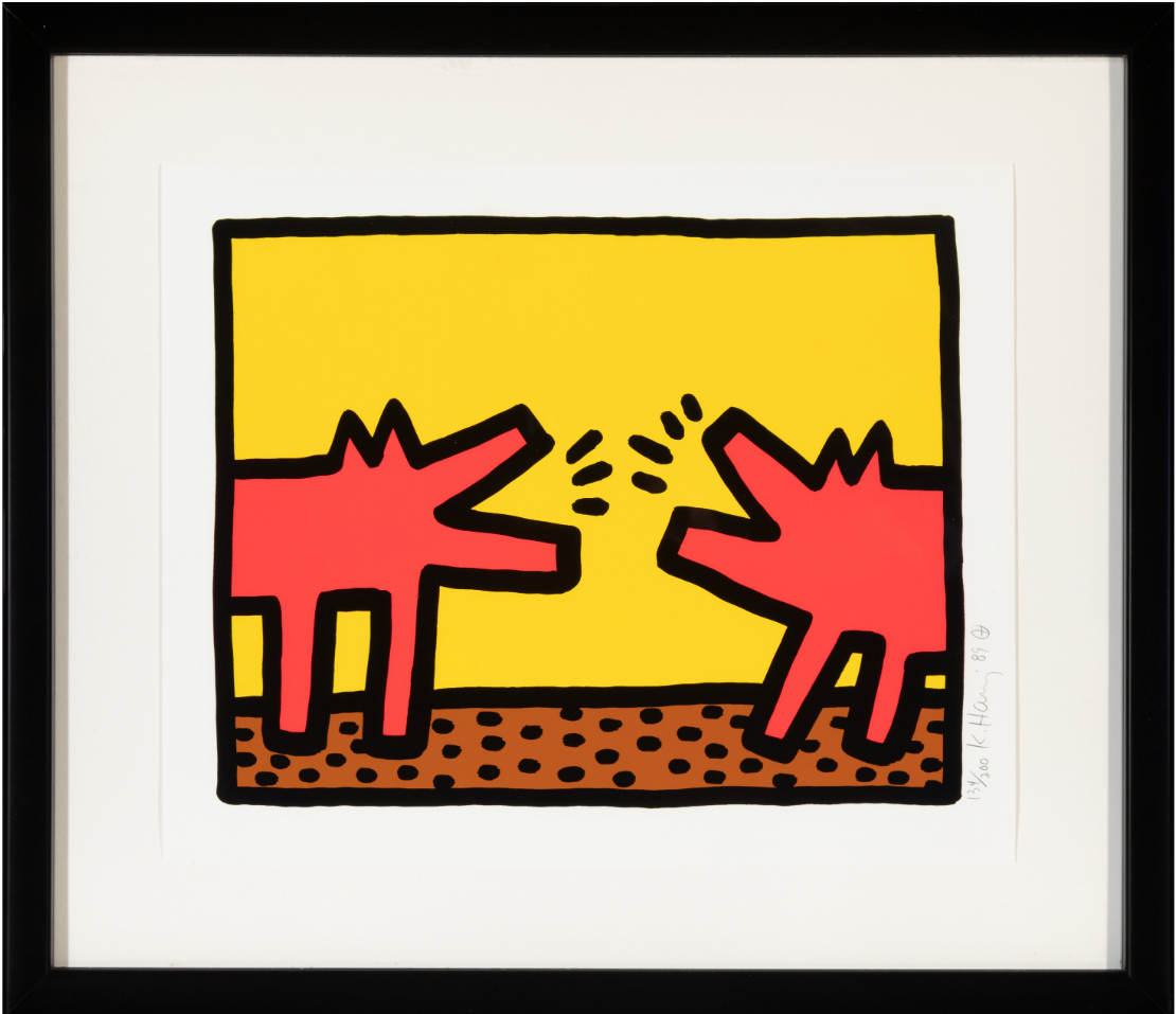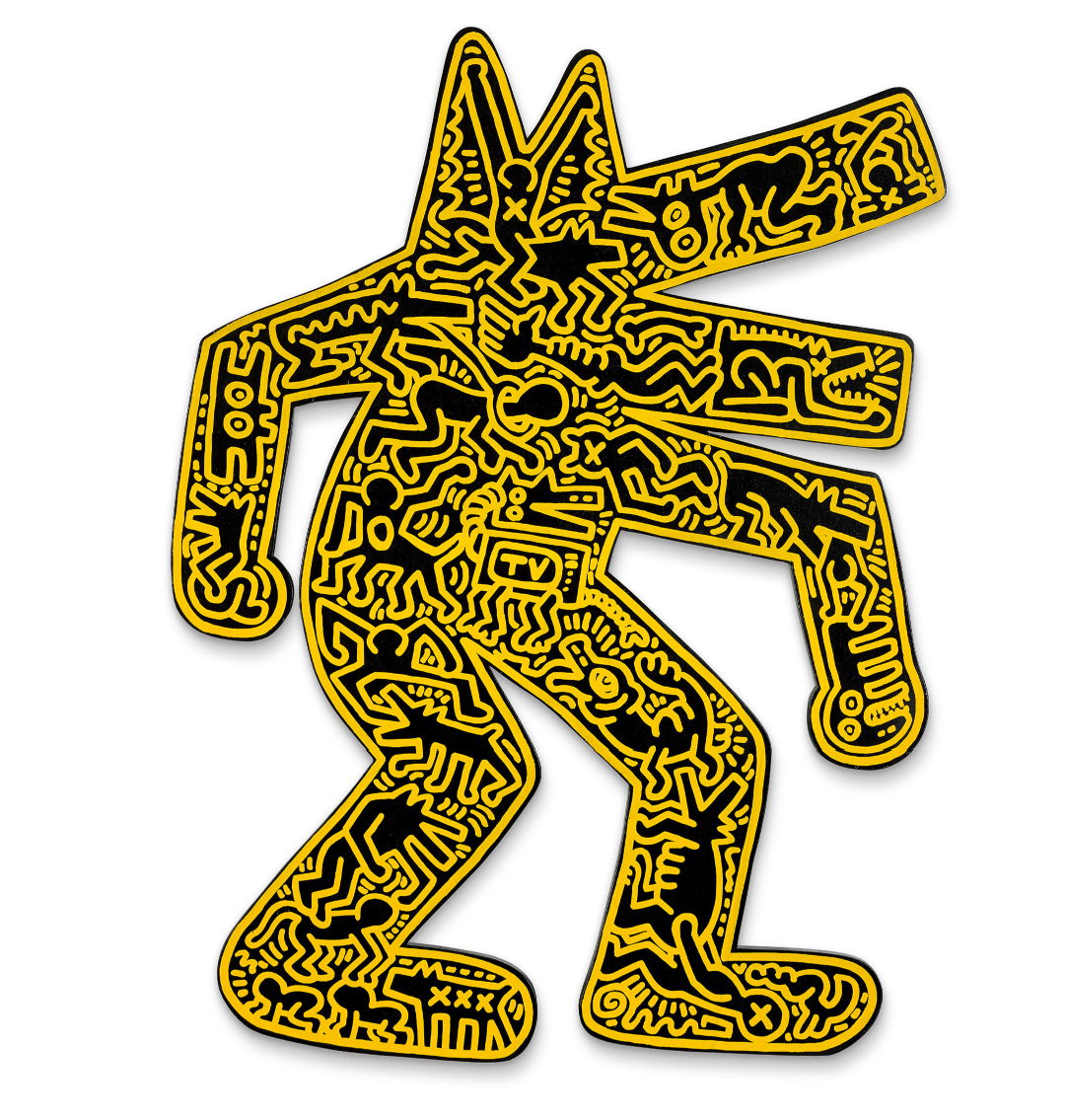First appearing in a subway drawing series from 1980-85, the barking dog is one of Keith Haring’s most well-known subjects. Both dogs and dog-human hybrids feature prominently in his works. Interpreted as a universal symbol of resistance and protection, barking to call out social injustice, the dog warns viewers of the abuses of power that pervade everyday life in America and beyond.