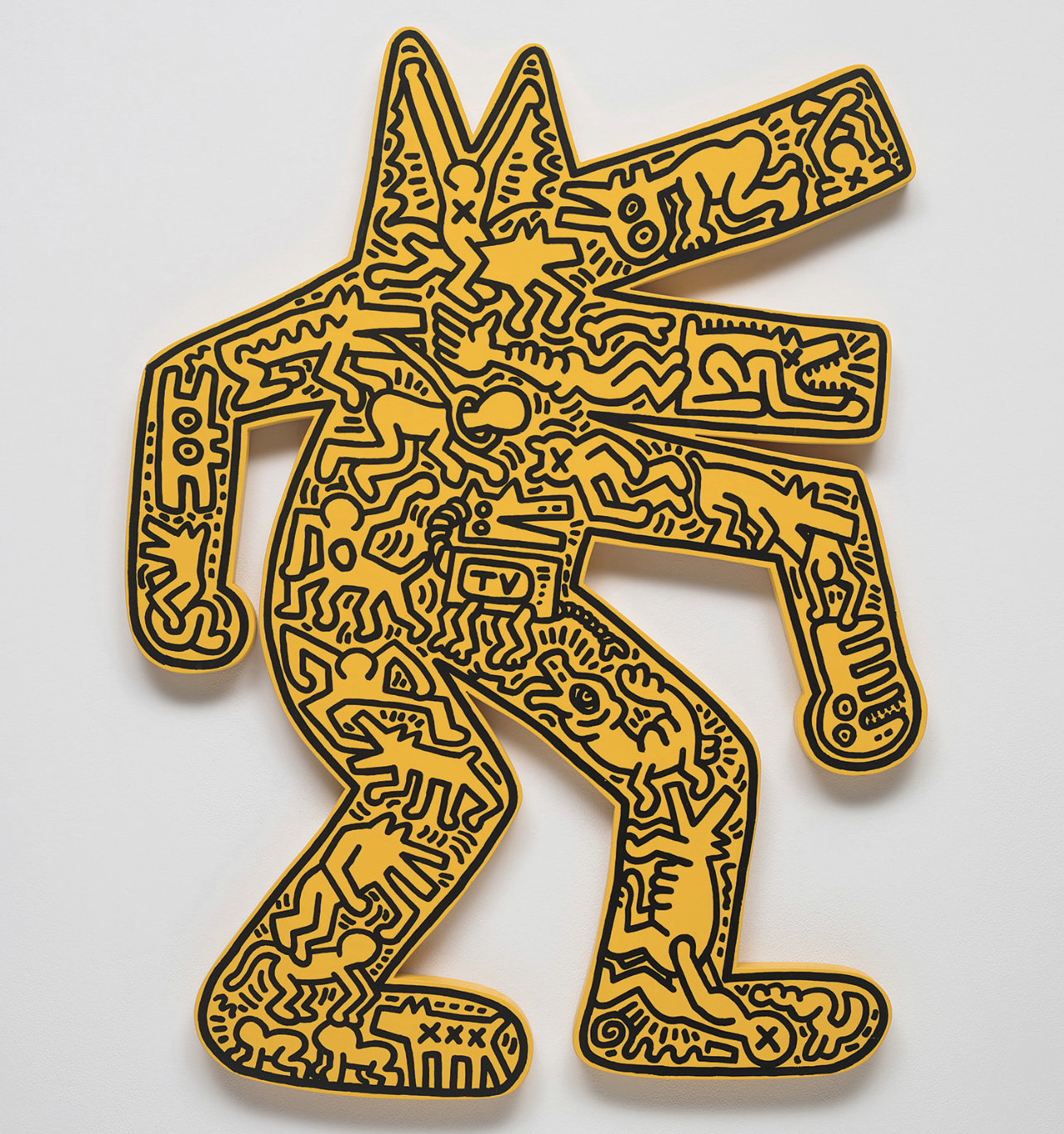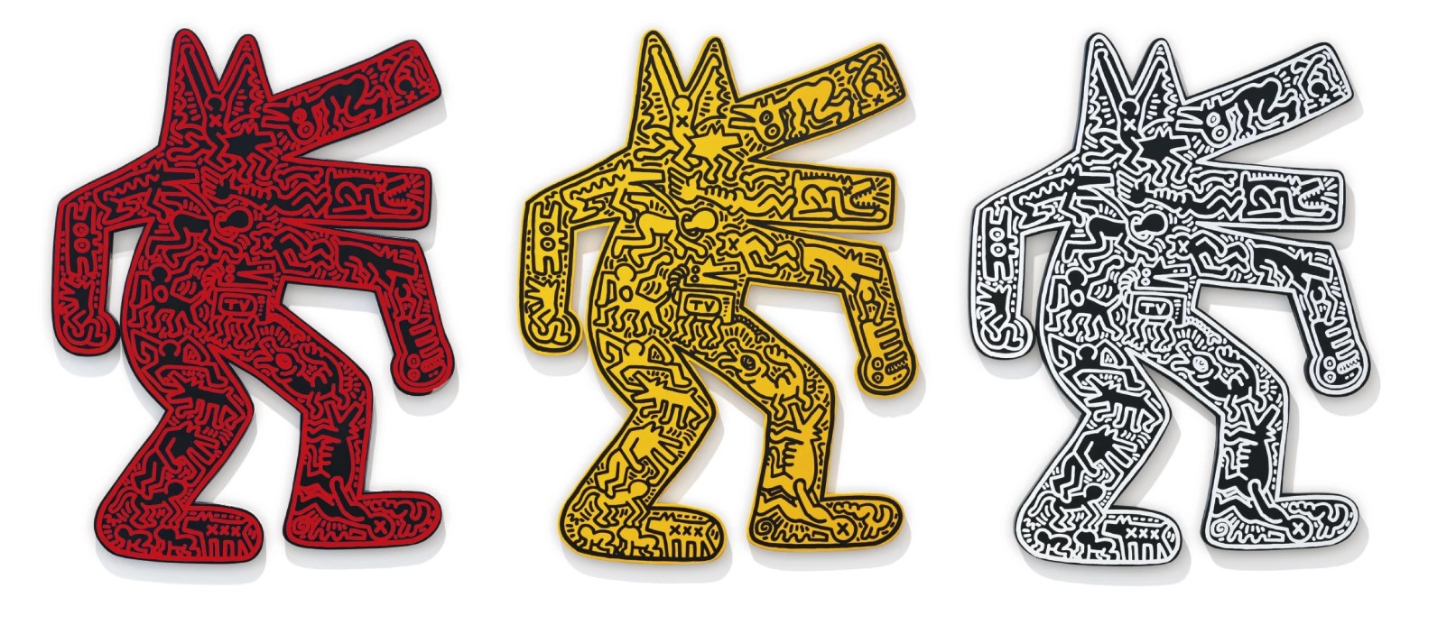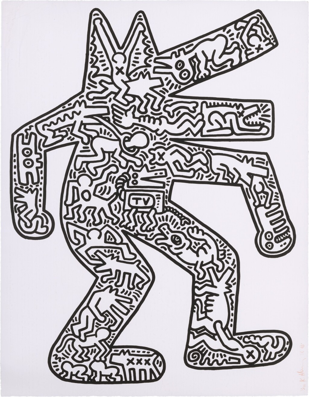 First appearing in a subway drawing series from 1980-85, the barking dog is one of Keith Haring’s most well-known subjects. Both dogs and dog-human hybrids feature prominently in his works. Interpreted as a universal symbol of resistance and protection, barking to call out social injustice, the dog warns viewers of the abuses of power that pervade everyday life in America and beyond.