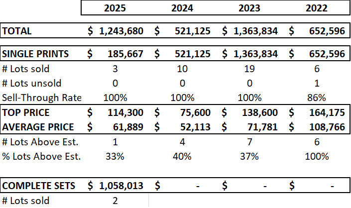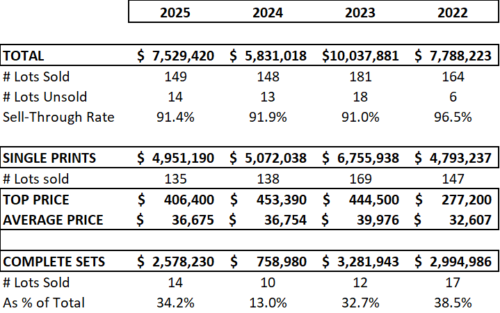 149 lots sold at auction in 2025 for a total turnover of USD 7,529,420. The sell-through rate remains solid in 2025 at 91.4%.
