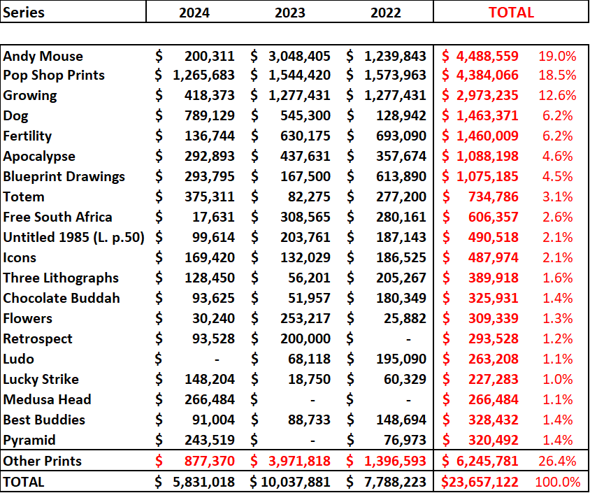 This sharp decrease in 2024 is explained by the top of the market, for example Andy Mouse generated a turnover of USD 3,048,405 in 2023, notably through the sale of two complete sets, whereas it generated a turnover of only USD 200,311 in 2024, through the sale of only one single print.
