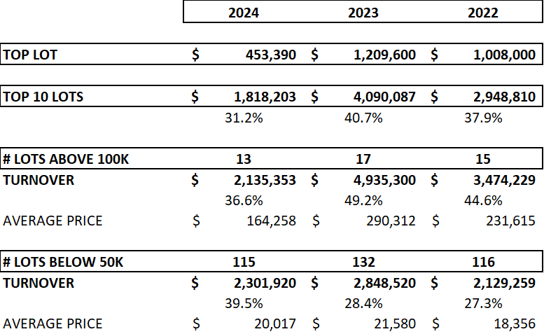 148 lots sold at auction in 2024 for a total turnover of USD 5,831,018, this compares to 181 lots sold in 2023 for a turnover of USD 10,037,881. The sell-through rate remains solid in 2024 at 91.9%, but still substantially lower than the 96.5% in 2022.