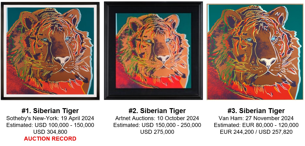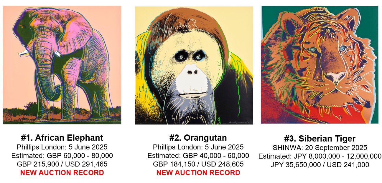 35 Complete Sets sold at auction in 2025 for a total turnover of USD 18,220,325. The highest price was achieved by Marilyn, that sold at Ketterer Kunst in Munich, on 5 December 2025, sold for EUR 4,488,000 (USD 5,206,080), a new auction records for a complete set of Marilyn.