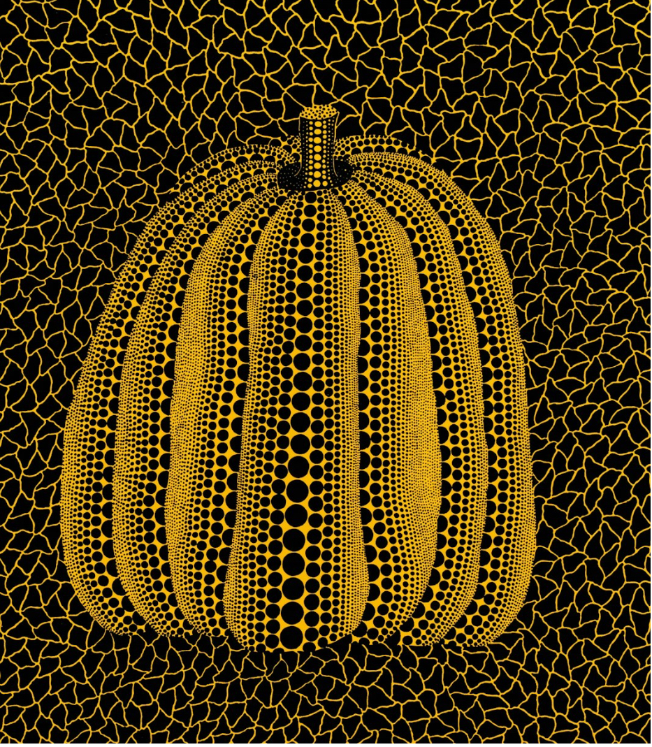 Yayoi Kusama’s Pumpkin presents a striking black pumpkin set against a calm pale background. The pumpkin, with its smooth, rounded form, is adorned with Kusama’s signature polka dots, creating a simple yet compelling contrast. The dots, varying slightly in size, add depth to the pumpkin’s silhouette, accentuating its bulbous shape. The pumpkin’s stem, gently tilted to the left, adds a subtle dynamic to the otherwise minimalist composition. This work captures Kusama’s ability to evoke depth and movement within a pared-back, geometric framework, transforming the pumpkin into a quiet but powerful symbol of her artistic vision.