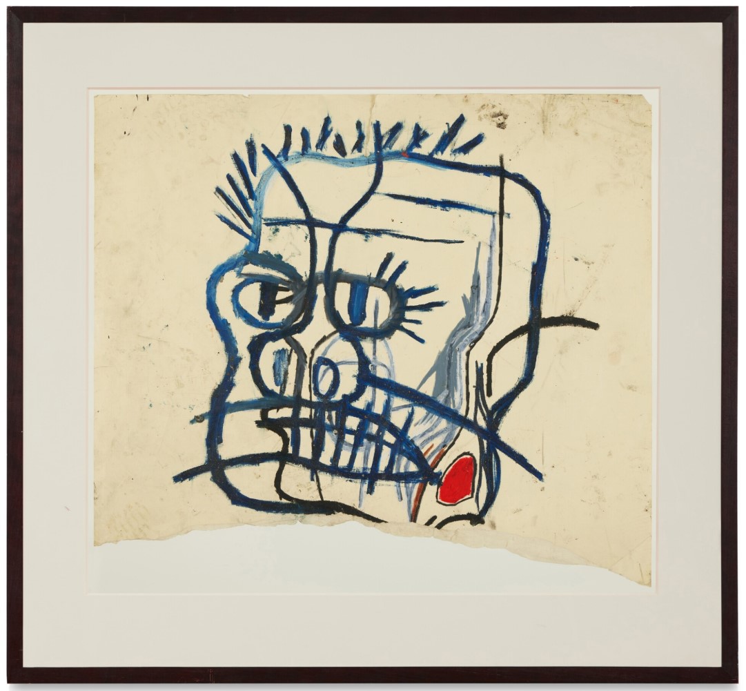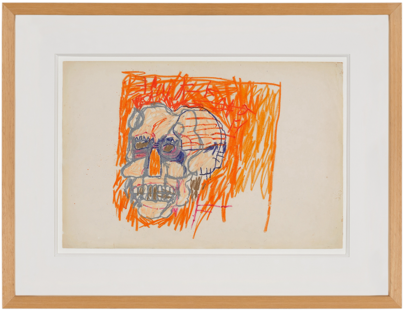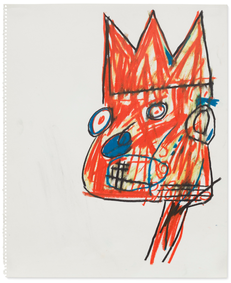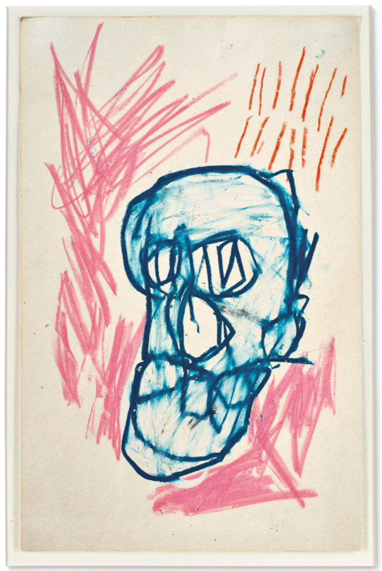 The curator Jeffrey Deitch delivered the eulogy at Basquiat’s funeral. ‘He was a personality unlike any other—a remarkable breadth, intelligence, passion, sympathy, generosity’, he told the congregation. His ‘charisma’ and ‘strength of character’, he went on, was such that even ‘a few lines drawn on paper could communicate so much’ (J. Deitch, quoted in P. Hoban, Basquiat: A Quick Killing in Art, London 1988, p. 311). The present work, ultimately, bears witness to this statement. Within a single oilstick head, Basquiat captures a life lived through art: from the child who pored over Gray’s Anatomy and the drawings of Leonardo da Vinci, to the young man working tirelessly in his studio to the thrum of cartoons and hip-hop music. It tells of days spent in the Brooklyn Museum looking at tribal masks and ancient Egyptian artefacts, and hours spent in front of Picasso’s Guernica at the Museum of Modern Art. His line crackles with energy; the surface quivers with the trace of his hand. It is a moving testament to an artist whose career was all too brief, and one who would live on through his art.