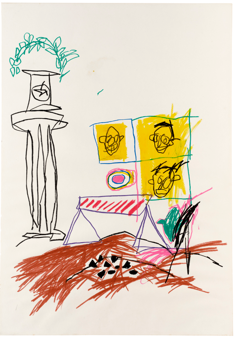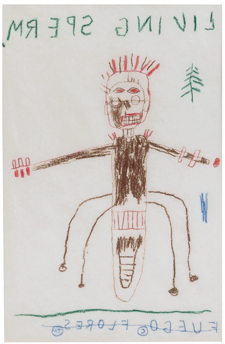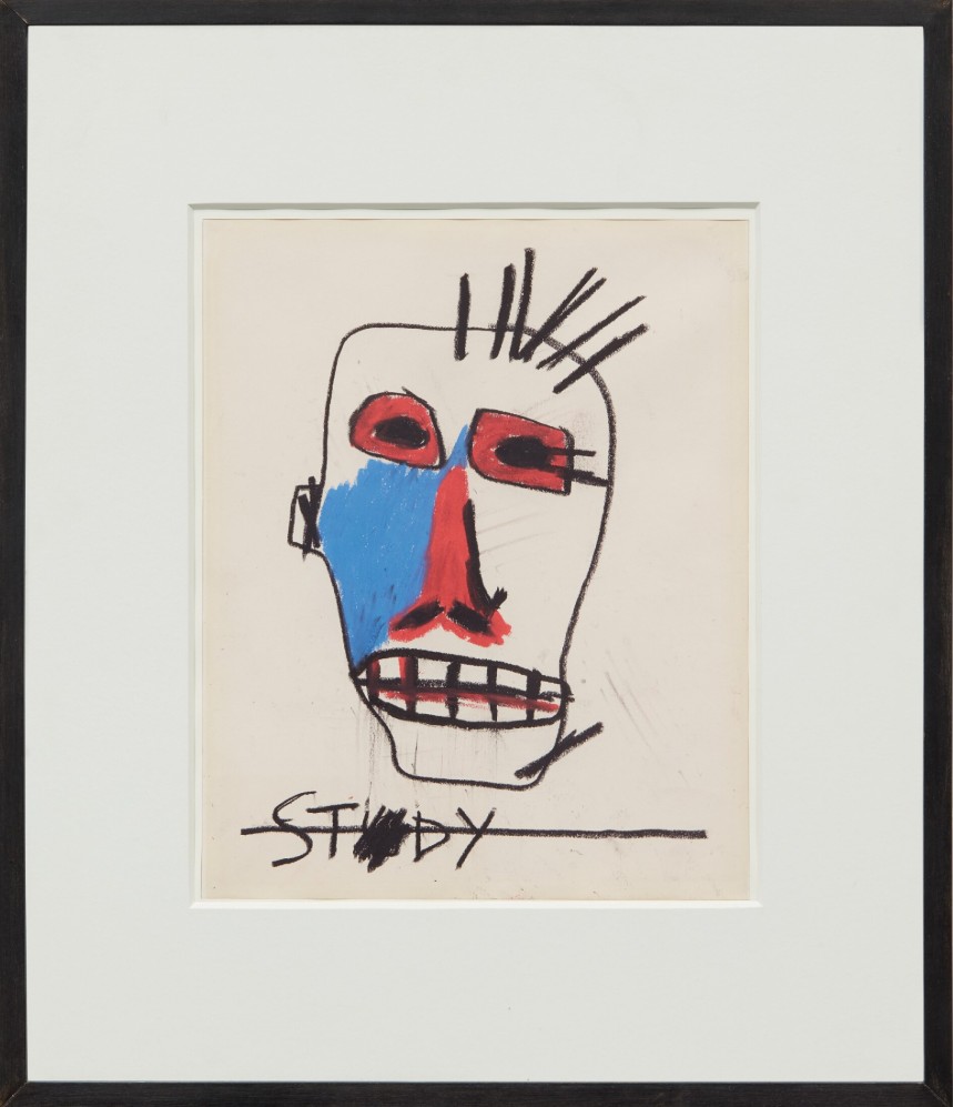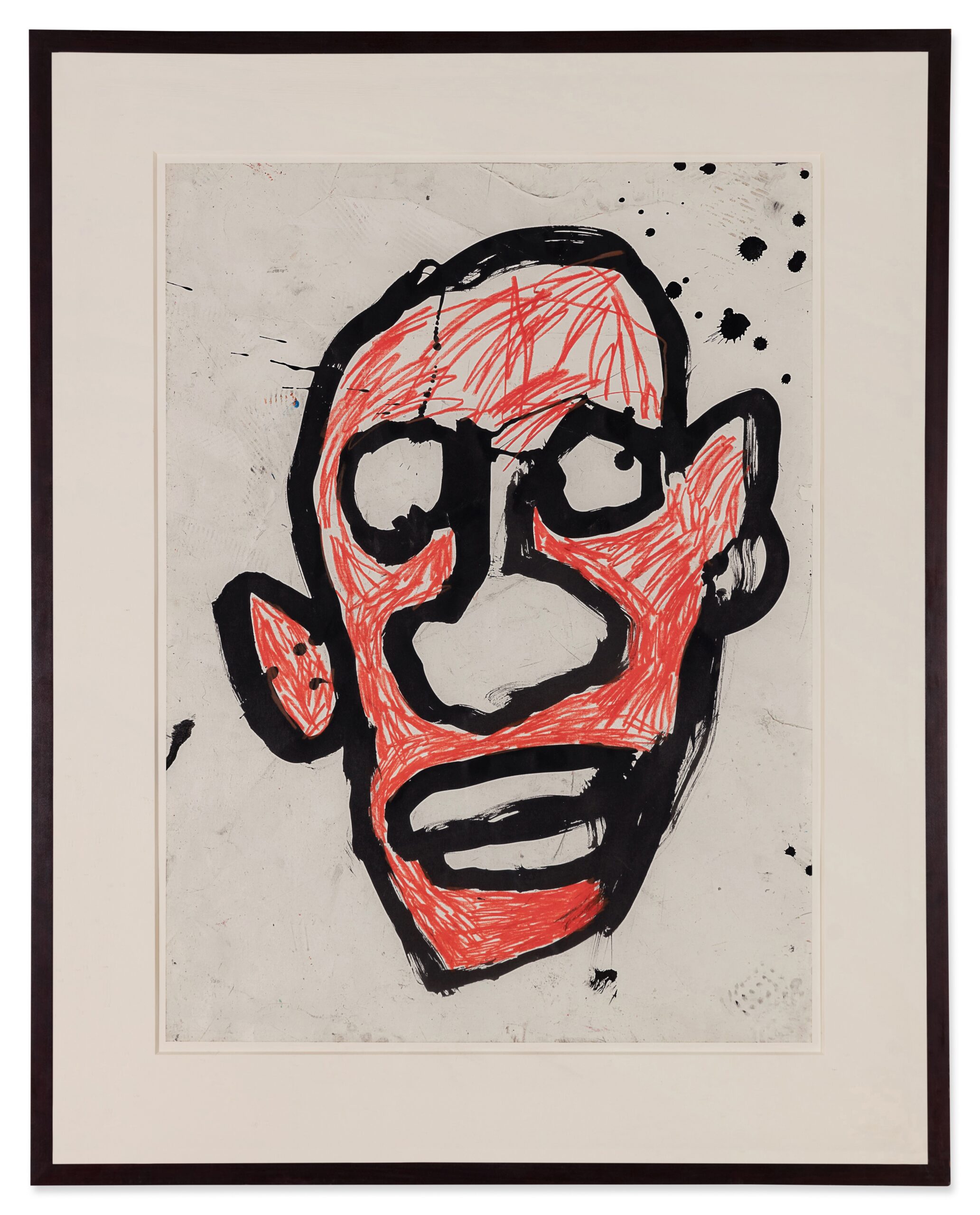 The curator Jeffrey Deitch delivered the eulogy at Basquiat’s funeral. ‘He was a personality unlike any other—a remarkable breadth, intelligence, passion, sympathy, generosity’, he told the congregation. His ‘charisma’ and ‘strength of character’, he went on, was such that even ‘a few lines drawn on paper could communicate so much’ (J. Deitch, quoted in P. Hoban, Basquiat: A Quick Killing in Art, London 1988, p. 311). The present work, ultimately, bears witness to this statement. Within a single oilstick head, Basquiat captures a life lived through art: from the child who pored over Gray’s Anatomy and the drawings of Leonardo da Vinci, to the young man working tirelessly in his studio to the thrum of cartoons and hip-hop music. It tells of days spent in the Brooklyn Museum looking at tribal masks and ancient Egyptian artefacts, and hours spent in front of Picasso’s Guernica at the Museum of Modern Art. His line crackles with energy; the surface quivers with the trace of his hand. It is a moving testament to an artist whose career was all too brief, and one who would live on through his art.