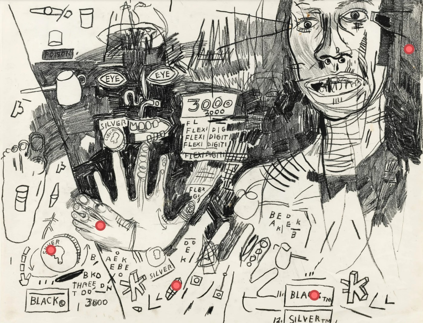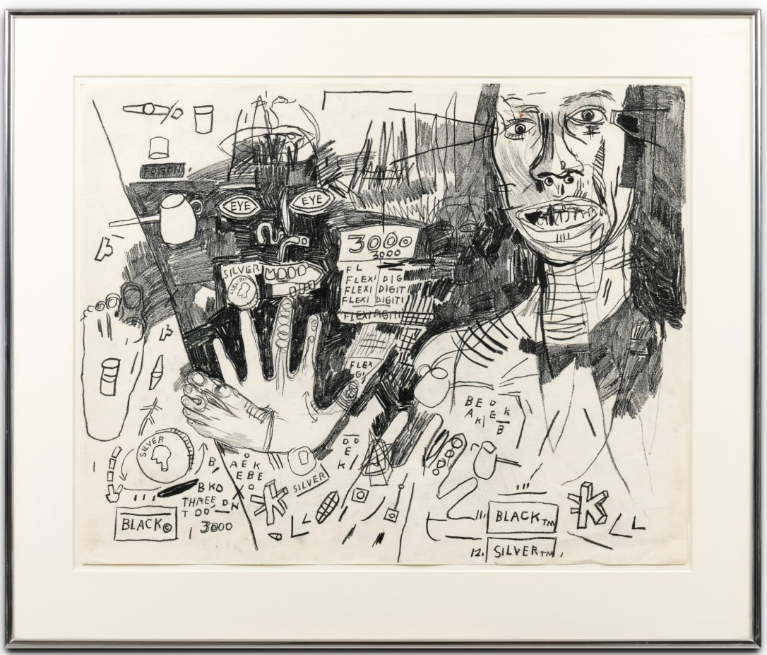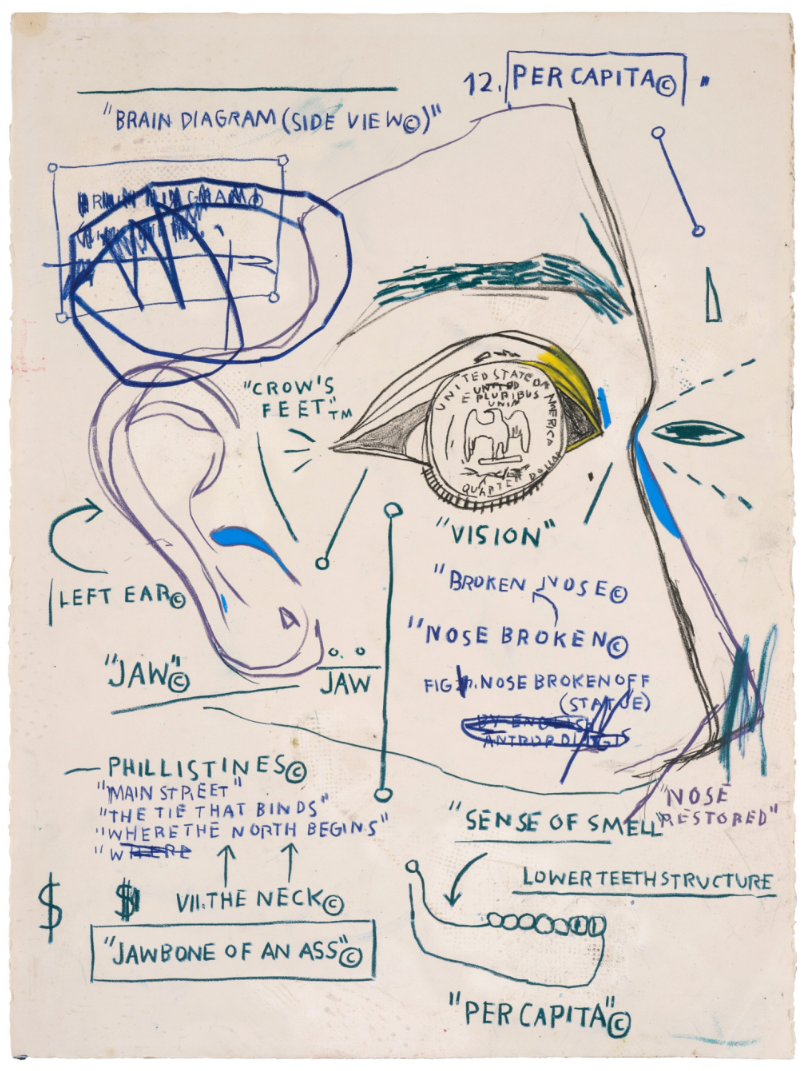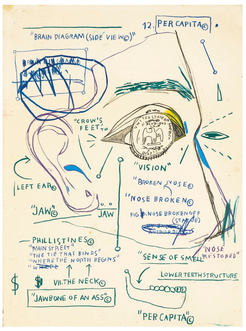 A combination of symbolic abstraction and categorical figuration, the present work includes various symbols that allude to Basquiat’s view of the world around him. Within the present work, words such as “FLEXI”, “SILVER”, and the trademarked “BLACK” as well as numbers like “3,000” are scattered throughout the composition. Several renditions of faces, hands, feet, and teeth, stemming from Basquiat’s fascination for Henry Gray’s Gray’s Anatomy , are revealed under a sea of black shading, that fills the composition through its horizontal and vertical lines. Images of U.S. quarters and watering pots as well as various geometric shapes stand out. The consistent use of the trademarked word “BLACK” could signal Basquiat’s identity. Most notably, however, is the drawing of a man’s face at the upper right corner of the composition. The gaping, voided stare is eerily reminiscent of Leonardo da Vinci’s Mona Lisa, which Basquiat admired and studied extensively.
