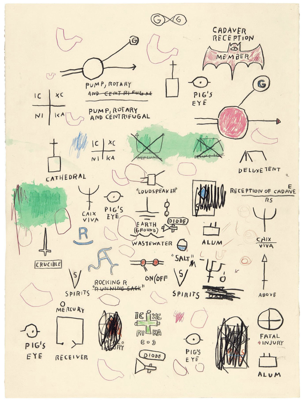 Untitled brings together the artist’s expressive rawness and primitive style, with a recording of phrases and hieroglyphics akin to stream-of-consciousness writing. “PUMP, ROTARY AND CENTRIFUGAL” and “FATAL INJURY” are some of the most noticeable phrases in the drawing. But even more captivating are the graphic symbols, inspired by Henry Dreyfuss’ Symbol Sourcebook: An Authoritative Guide to International Graphic Symbols published in 1972. After Basquiat studied this textbook, he started integrating many of the symbols Dreyfuss codified into his own works. In Untitled, one example is the circle with a diagonal line protruding from the top corner with a “G” at the end. Intertwined with this kind of symbolism, we find other recognizable motifs like the pig’s eye, the Batman logo, and a sword. The ambivalent references embodied in this work, also reveal Basquiat’s mental state during this time of his life, when he was struggling with addiction and intense personal loss. These emotions can be felt in the symbols of mortality, anatomy, and alchemy, alongside words like “CRUCIBLE” and “SPIRIT.” In Untitled, the symbols, imagery and text are rendered with a dark black crayon, making them stand out from the negative spaces in the sheet. These come into contact with a few bright green watercolor brushstrokes and scattered blue, red, and pink scribbles, all of which together illustrate how Basquiat embraced text and color seamlessly throughout his practice.