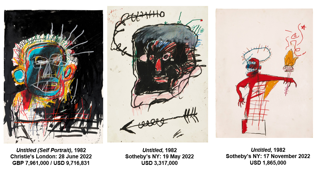 20 Works on Paper sold at auction in 2022 generating a total turnover of USD 23,364,190. The highest price was achieved by Untitled (Self-Portrait), a drawing dated 1982, that sold at Christie’s in London on 28 June 2022 for GBP 7,961,000 (USD 9,7,831).