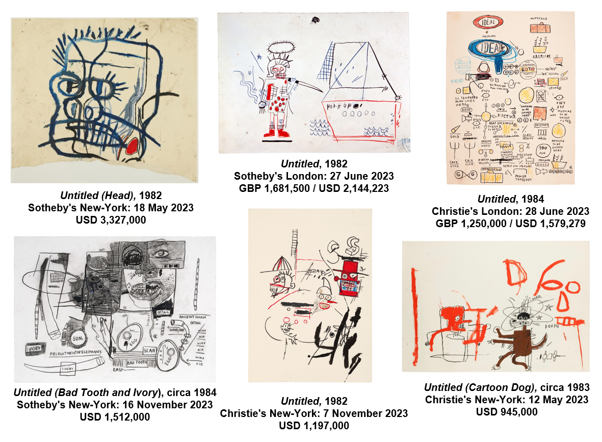 19 Works on Paper sold at auction in 2023 for a total turnover of USD 16,758,407. With 4 lots failing to sell, the sell-through rate is 81%. 5 lots sold for a price over USD 1 million, generating a turnover of USD 9,759,502, contributing 58.2% to the 2023 total turnover. The highest price was achieved at Sotheby’s in New-York on 18 May 2023, when Untitled (Head), a work on Paper dated 1982 sold for USD 3,327,000.