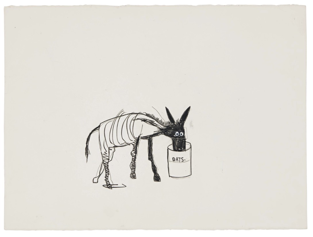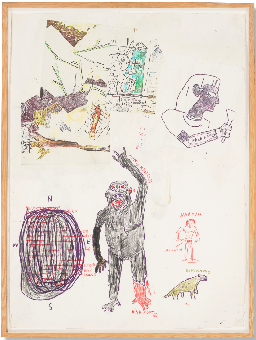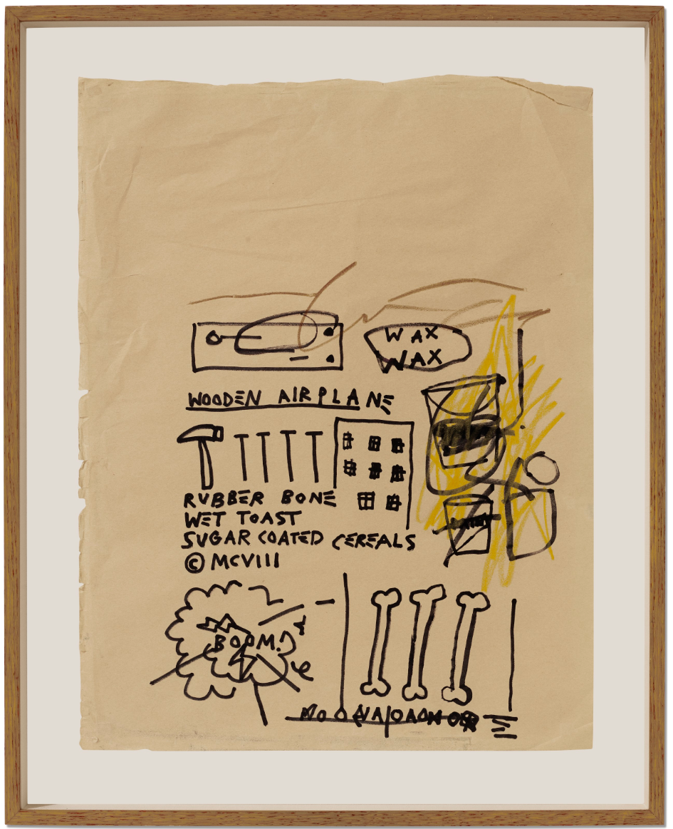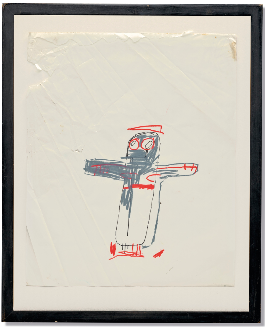 Jean Michel-Basquiat distinguished himself from his contemporaries by the amount of works on paper he executed, and the artistic achievements he realized with this medium. He treated drawing with the same importance as he treated painting, making each one a work of art in its own right. Basquiat was attracted to the immediacy of the act of drawing, and the similarities this medium shared with graffiti, having started as an artist on the streets. Drawing became a way of channeling his inner thoughts, impressions, memories, and fantasies. It is easy to see the appeal of paper as a medium for Basquiat. A self-taught artist, his genius lay in his instinctive understanding of composition and unique iconographic lexicon, and the immediacy of paper as a medium provided the perfect vehicle for Basquiat’s innate brilliance. Furthermore, the paper itself, which bears its history so lightly, with dust and footprints from the studio visible throughout, insists on the performative element of Basquiat’s practice.