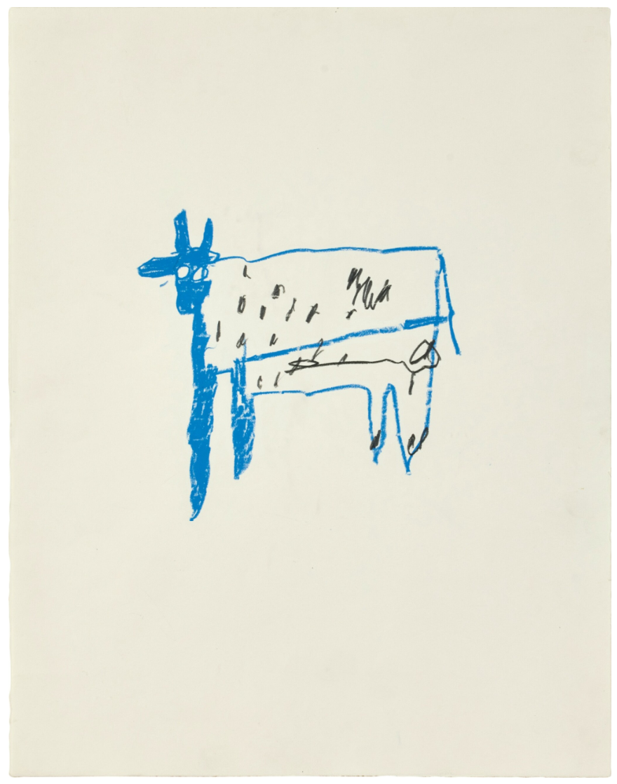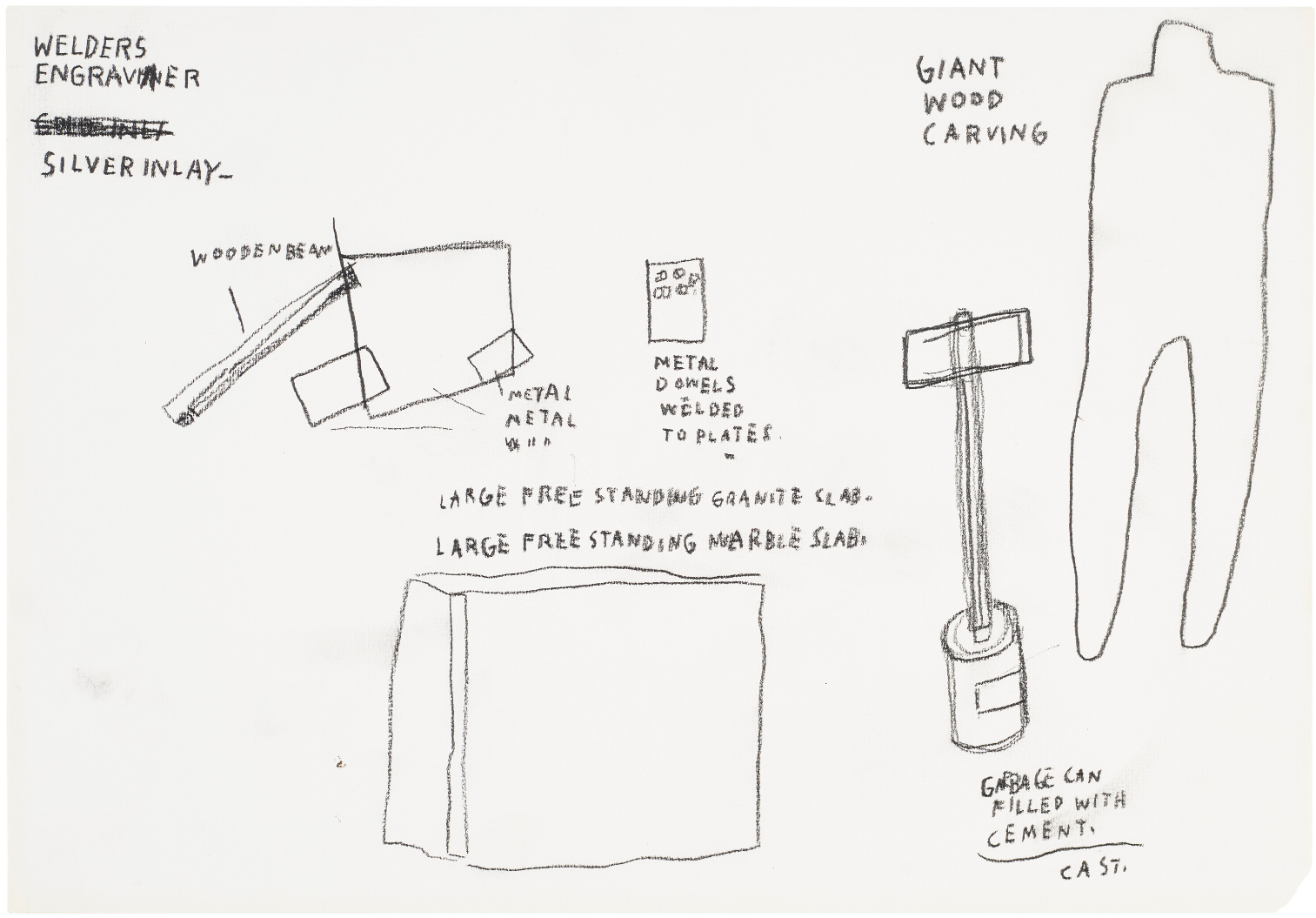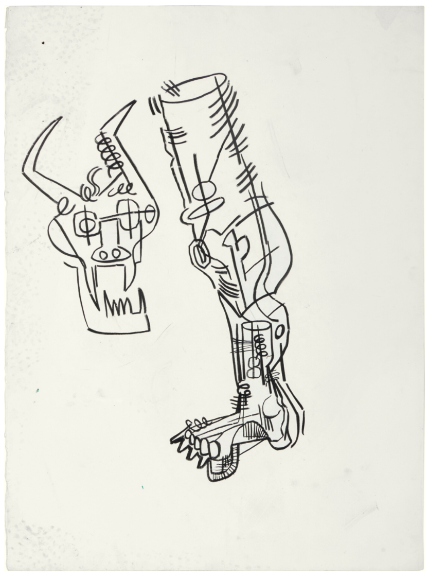 Jean Michel-Basquiat distinguished himself from his contemporaries by the amount of works on paper he executed, and the artistic achievements he realized with this medium. He treated drawing with the same importance as he treated painting, making each one a work of art in its own right. Basquiat was attracted to the immediacy of the act of drawing, and the similarities this medium shared with graffiti, having started as an artist on the streets. Drawing became a way of channeling his inner thoughts, impressions, memories, and fantasies. It is easy to see the appeal of paper as a medium for Basquiat. A self-taught artist, his genius lay in his instinctive understanding of composition and unique iconographic lexicon, and the immediacy of paper as a medium provided the perfect vehicle for Basquiat’s innate brilliance. Furthermore, the paper itself, which bears its history so lightly, with dust and footprints from the studio visible throughout, insists on the performative element of Basquiat’s practice.