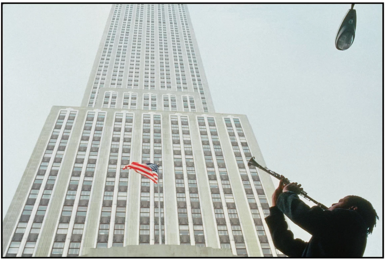Trademark and copyright symbols—ubiquitous in Basquiat’s work—appear throughout, referencing authorship and ownership. These markings also echo his graffiti roots and his use of the SAMO tag. The work’s central figures—a trumpet player labeled “AS GABRIEL // GABRIEL FIG.” and a guitarist in a blue suit—connect Basquiat to music and spirituality. The archangel Gabriel, associated with the trumpet and divine announcements, may also serve as a metaphor for the artist himself—a messenger, performer, witness, or even avatar. The central guitarist, faceless save for a floating brain, evokes sound through color and gesture. Capitalized words across the composition suggest rhythm, while scribbled-out passages heighten textual ambiguity, mirroring the improvisational spirit of jazz. Repetition, a core technique in both Basquiat’s work and jazz, reinforces this connection.