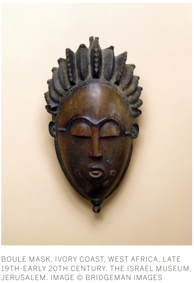 Highly energetic, Basquiat’s gestural brushwork here has rendered the subject’s body with a vigour and tenderness that highlights his deep engagement with sources as disparate as anatomical drawings, African art, and modern painting. Indeed, it was Basquiat’s representations of the human form that initially garnered him such widespread acclaim. As Kellie Jones notes, ‘Basquiat’s canon revolves around single heroic figures: athletes, prophets, warriors, cops, musicians, kings and the artist himself.’i The promethean figure here rises triumphantly despite his almost skeletal form; his fragility and his humanity openly evident to the viewer. Basquiat has chosen not to armour his hero with signs and symbols, nor has he adorned him with his signature crown. Instead, Basquiat peels back his figure, revealing the vulnerable soft tissue and organs within. In laying bare the raw physicality of his figure, Basquiat imbues his work with a vivid humanity that is at once both compassionate and evocative of African figurative traditions. The exaggerated cranium, the ordered rows of set teeth and contoured eyes recall the expressive and visually striking designs of African carved masks. The figure is then both a tribute and a rebuke to Western art history; whereas such African figures had so influenced Pablo Picasso amongst others, Basquiat firmly foregrounds the African figurative tradition in the familiar Western trope of the memento mori.