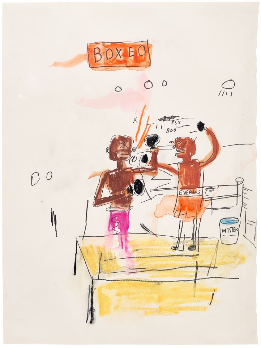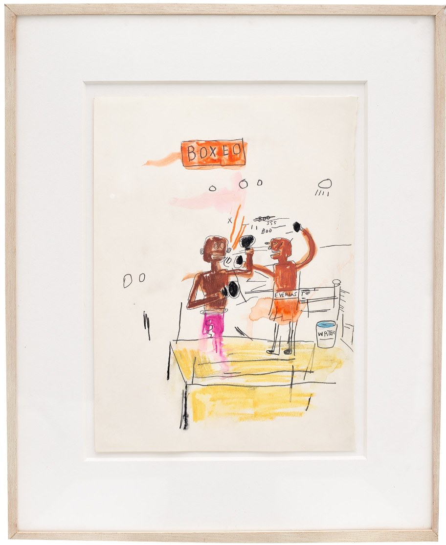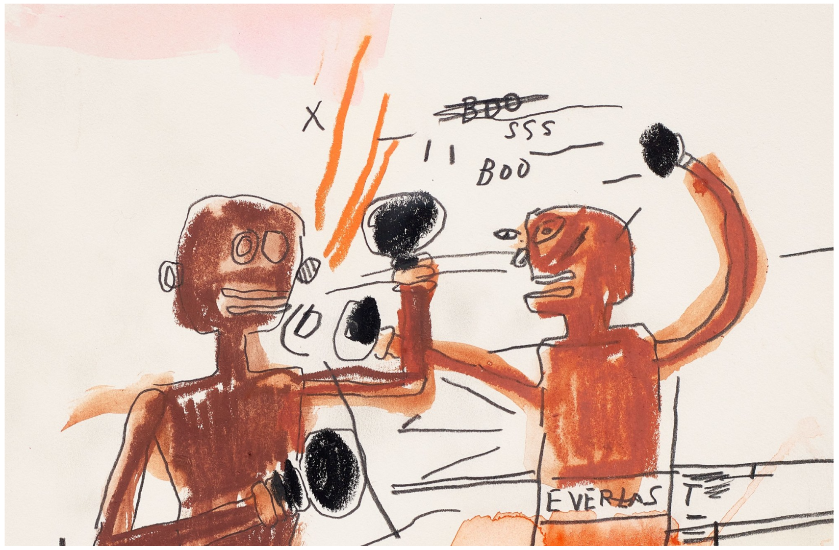 In this intimate work on paper, Basquiat portrays two Black fighters engaged in combat, their forms distilled to essential gestures that radiate vitality. The figure on the left, adorned in purple shorts, adopts a defensive stance against his opponent, who is marked with the EVERLAST logo – a commercial reference that anchors the scene in reality. The composition exemplifies Basquiat’s ability to blend a seemingly casual drawing style with sophisticated artistic choices. The boxing ring, indicated by minimal lines and a floor washed in yellow, hovers within a white space punctuated by his signature atmospheric marks–floating circles and cryptic notations that evoke a sense of frenetic energy. A water bucket at ringside contributes both narrative detail and compositional weight, while the floating “BOO” above the figures adds an element of sound and emotional tension to the scene.