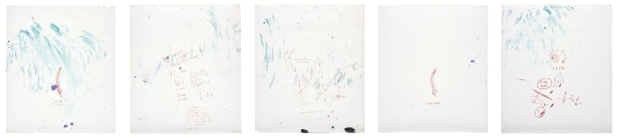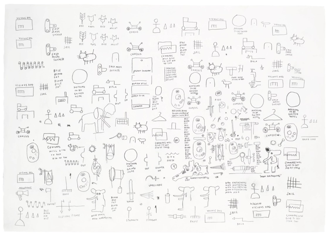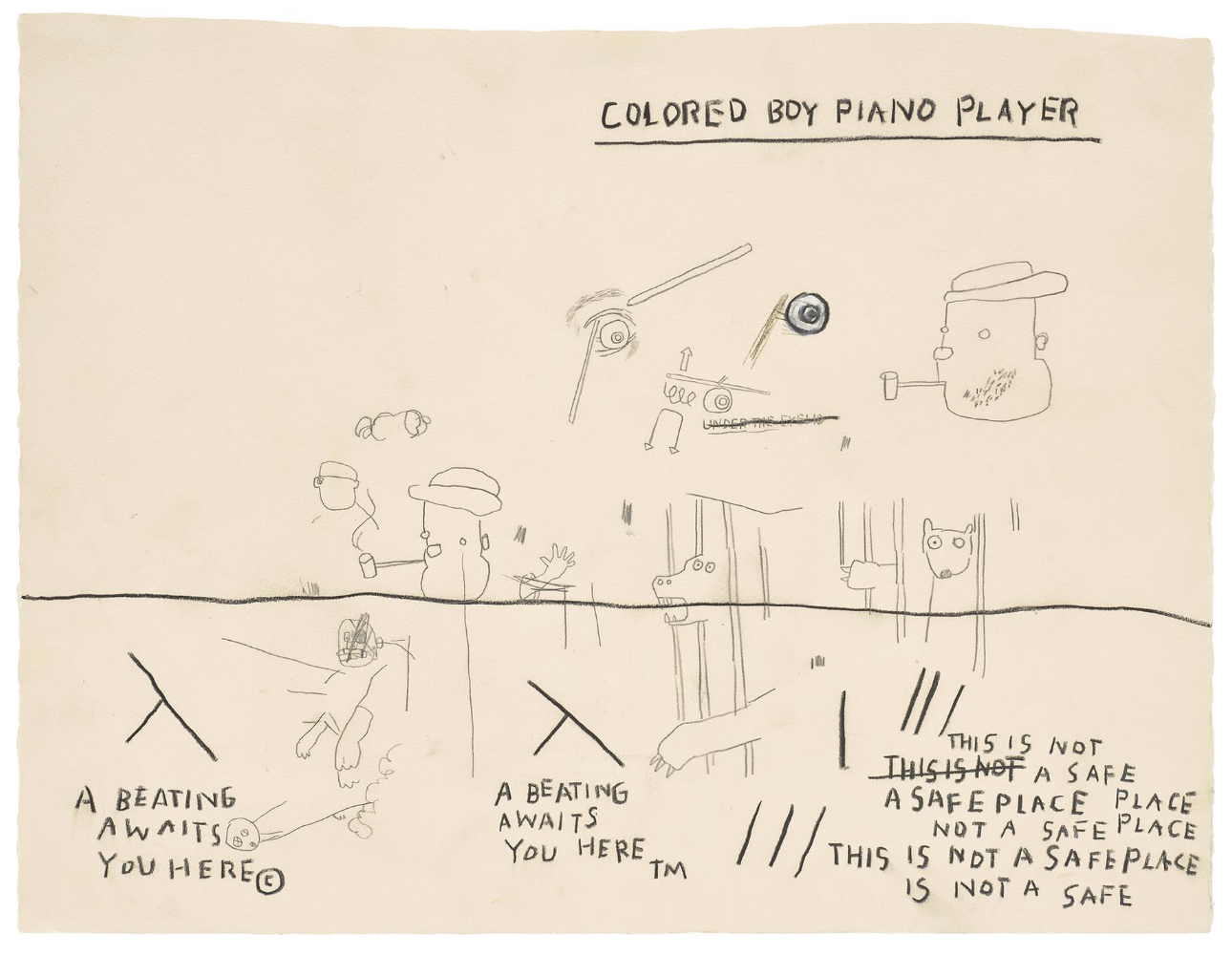 Reading the image from left to right, the graphic, comic strip style of the drawing takes on new significance, the repetitions of the symbols for ‘A beating awaits you here’ and ‘this is not a safe place’ visually replicating the itinerant wanderings of these individuals and reinforcing the relentless dangers that they faced on their travels. Combining image and text, Basquiat communicates this with striking directness, culminating in the rapid and running-on scrawled repetition of ‘this is not a safe place’ in the far left of the composition. In typical fashion, Basquiat’s social commentary here also invokes law keepers as dangerous figures, the coiled spring icon and circled symbols traditionally used to warn travelers of the proximity of judges and courthouses.