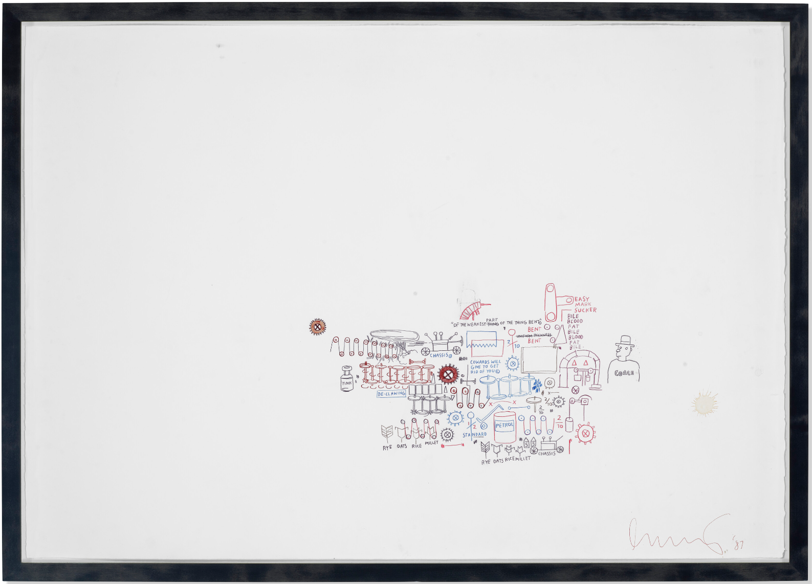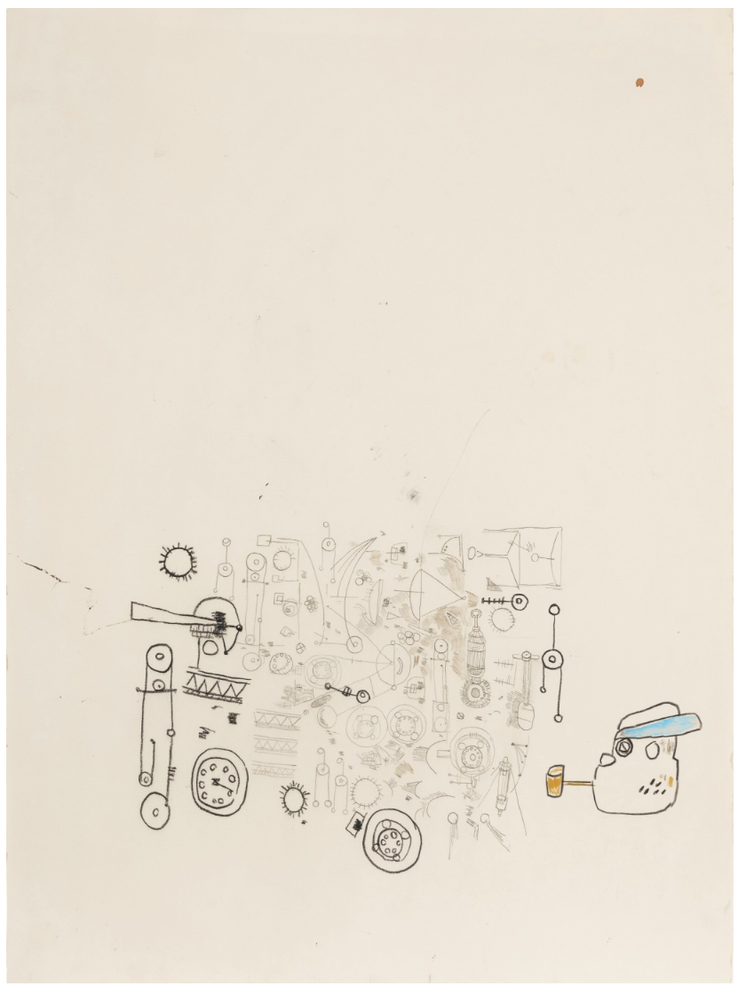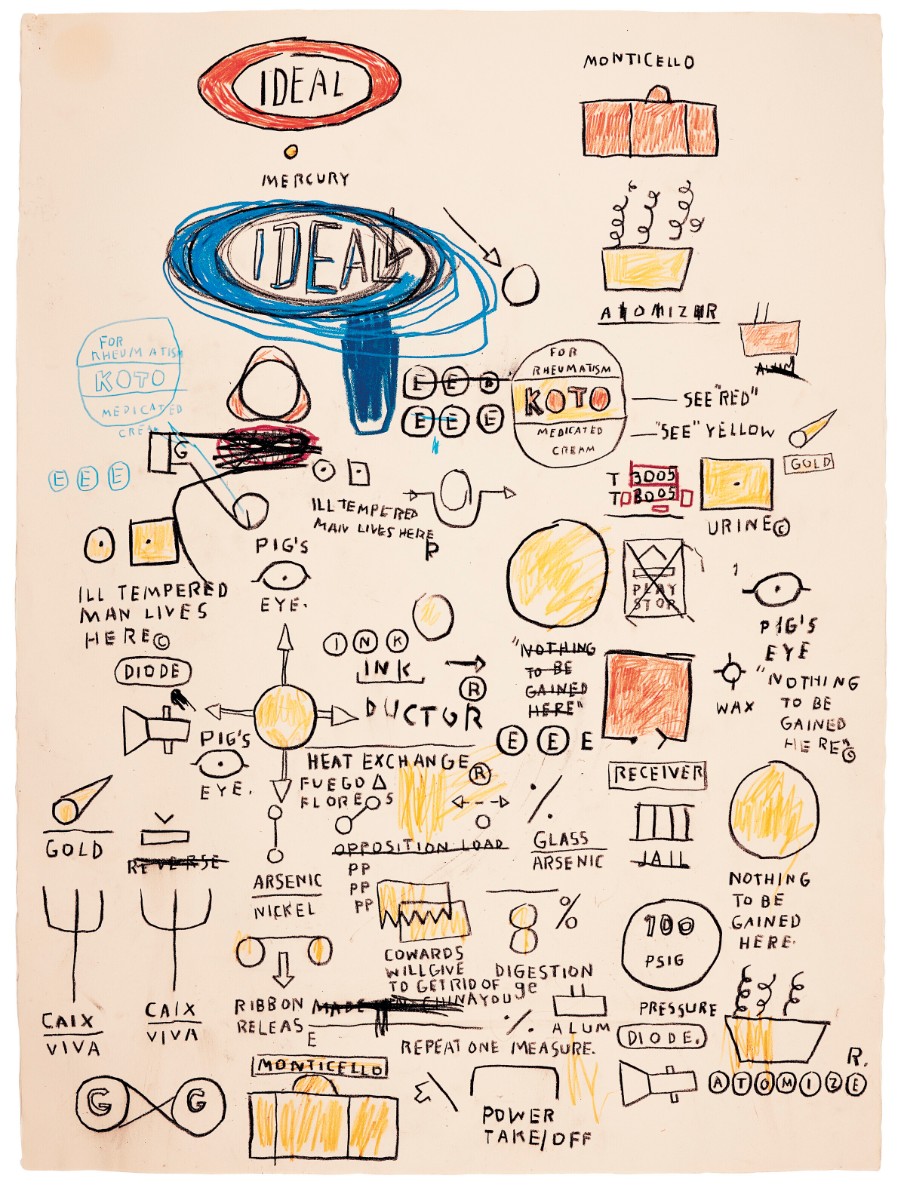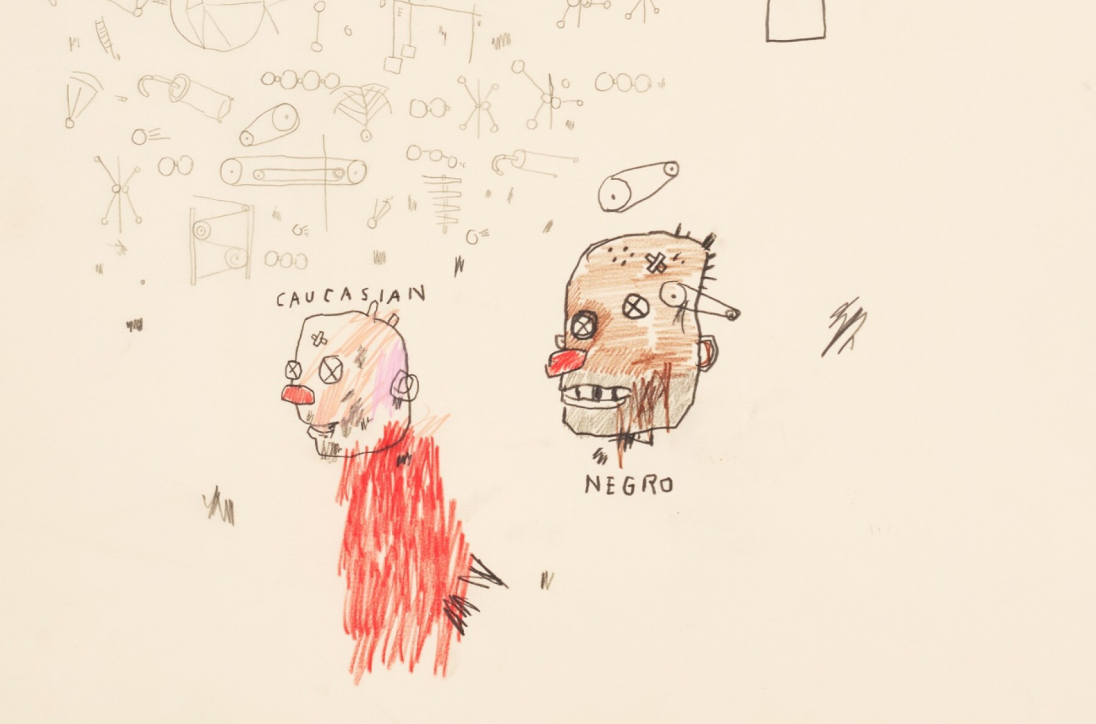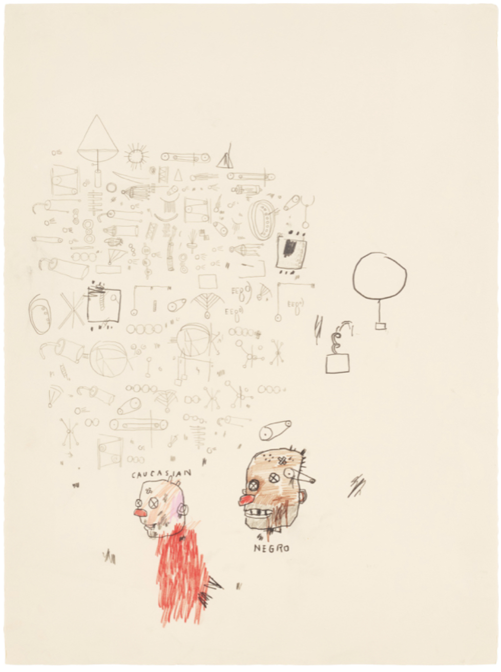 A complex labyrinth of symbols and images fills the space above two colorfully accentuated profiles of two heads. Reminiscent of the magical landscapes of pictorial metaphors and signs by Paul Klee, the symbols—largely references to chemistry, engineering and other scientific instruments from pulleys and gears to springs and weights—are not only an expression of the artist’s innovative visual lexicon but are indicative of Basquiat’s most impressive compositions. Descending from the constellation of mechanical drawings, viewers are struck by the two graphically composed heads of varying skin tones, aptly labeled “Caucasian” and “Negro.” Upon closer inspection, the bevy of scientific symbols appears to emerge exclusively from the “Caucasian” head, alluding to broader inequities baked in systems of knowledge. The “Negro” head, on the other hand, is excluded from this suggestive osmosis, cast to the side only to look upon its privileged neighbor.