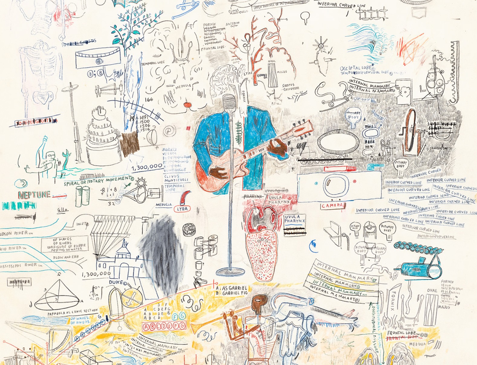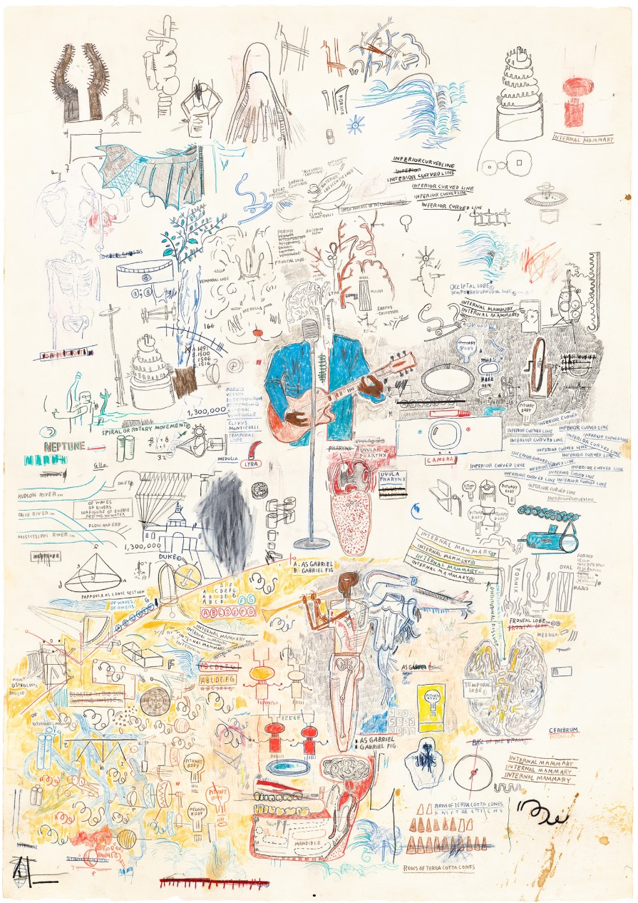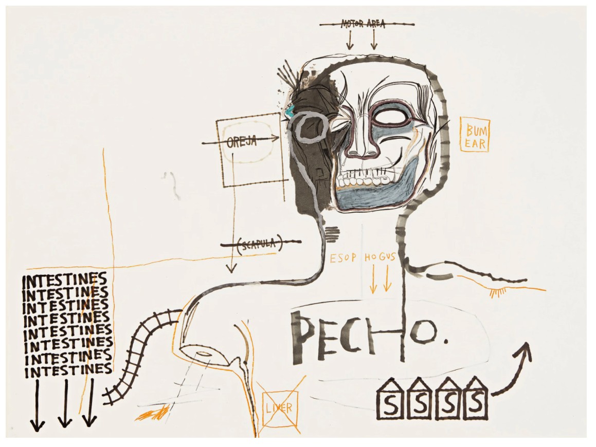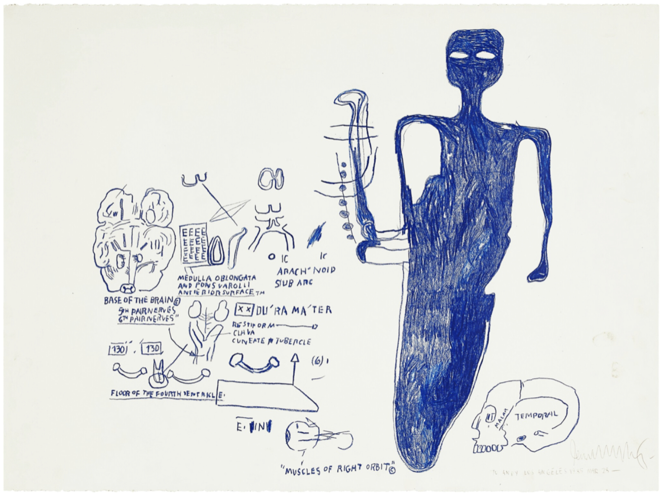The visual intensity of Untitled reflects Basquiat’s drive and meteoric success. The work displays his mature visual lexicon: a densely worked surface where incised oilstick marks create rich textural dimensions. Using both rapid gestures and precise detail, Basquiat blends text and image. Shifting between black, white, and color, he maps anatomy—the brain’s “FORNIX” and “LYRA”—and the torso of a guitar player, detailed but with a scribbled spinal column. In neuroanatomy, “Lyra” refers to a structure within the fornix, its name inspired by a triangular harp. This subtle reference—tied to Basquiat’s fascination with anatomy and music—exemplifies his ability to fuse scientific and artistic domains. His mother, Mathilde, nurtured these dual interests, introducing him to museums and gifting him Gray’s Anatomy (1878) after a childhood car accident. This event, which resulted in the removal of his spleen, profoundly influenced his recurring interest in the human body.