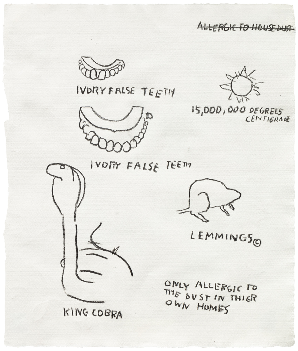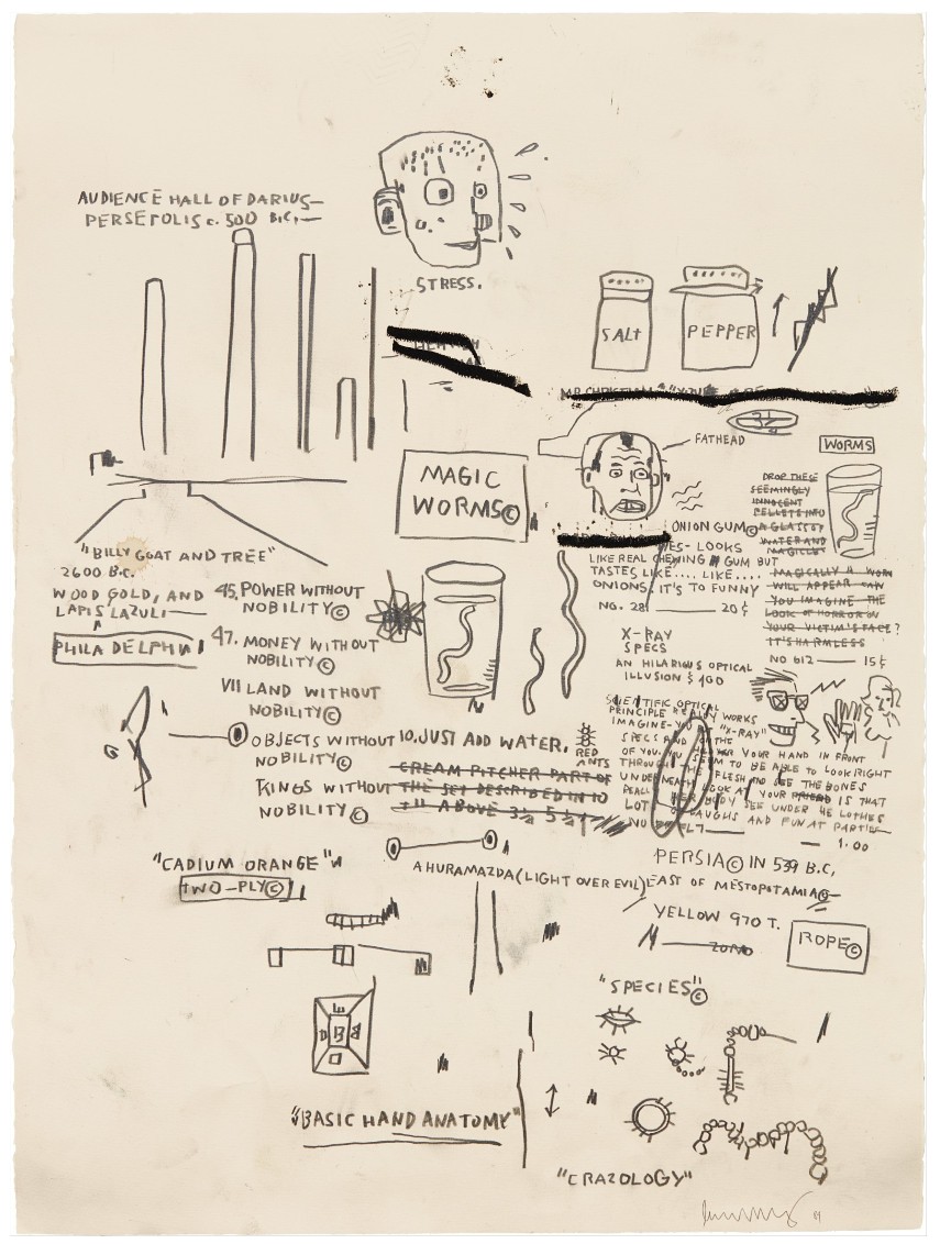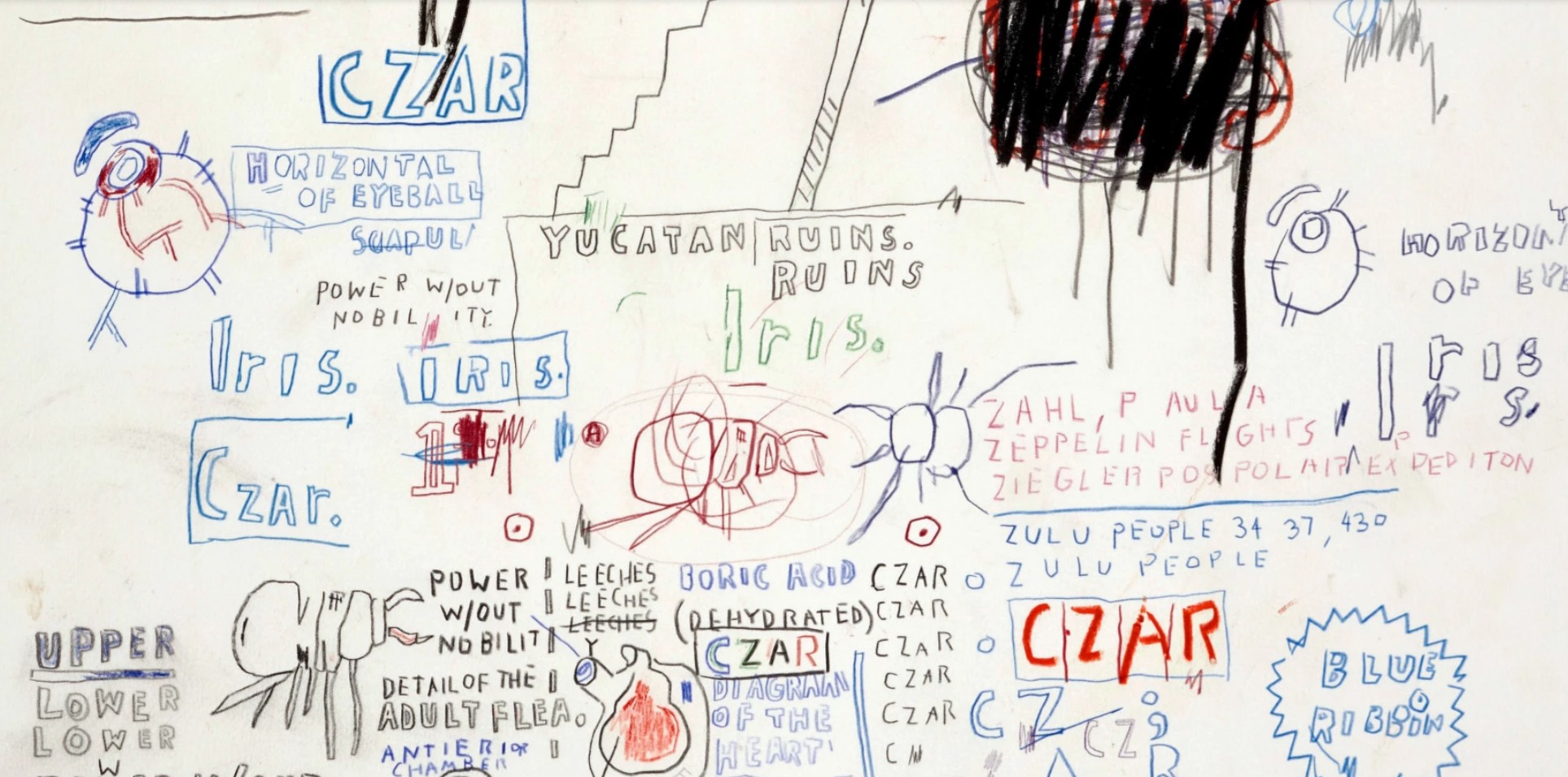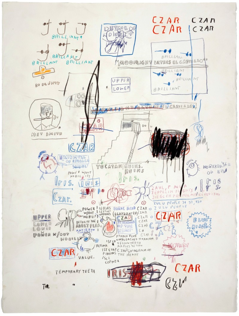 A complex labyrinth of symbols and images fills the sheet, the scattered words, staccato scribbles, and punctuating images conveying a lyrical sense of rhythm akin to the cadence of a jazz score. The titular “CZAR” is repeated no fewer than 19 times across the composition; this political term for a high-ranking official, coupled with phrases like “Power W/out Nobility,” “Leeches,” and “Dehydrated” as well as several drawings of adult fleas, offers clear insight into Basquiat’s perception of traditional power structures. Other cultural references are littered throughout. In the upper left, three characters from the early Dick Tracy comic books are referenced by name and image: Diet Smith, the industrialist and inventor; Brilliant, his blind genius son; and B.O. Plenty, a reformed criminal farmer. Appearing in many of Basquiat’s works from this period, the artist’s love of and familiarity with comic books and cartoons dates to his early childhood. A visual auto-didact, the images and animations of these books are amongst the vast and varied sources of rich visual media Basquiat collected over the course of his life and frequently appear in his paintings, creating a highly specific visual vernacular of cultural images and iconography at once universally familiar and entirely distinct. As well as cartoons, the present work also references an issue of National Geographic magazine: “Moonlight bathes El Castillo” appears twice above a sketch of “Yucatan Ruins.” Both the phrase and the image are quoted directly from a picture story on Maya’s sacred city. Fascinated by his own Caribbean and Hispanic cultural heritage, Basquiat’s works showcase his ever-expanding lens as to his place within the world, and the multitude of histories, myths, legends, and belief systems that shape us.