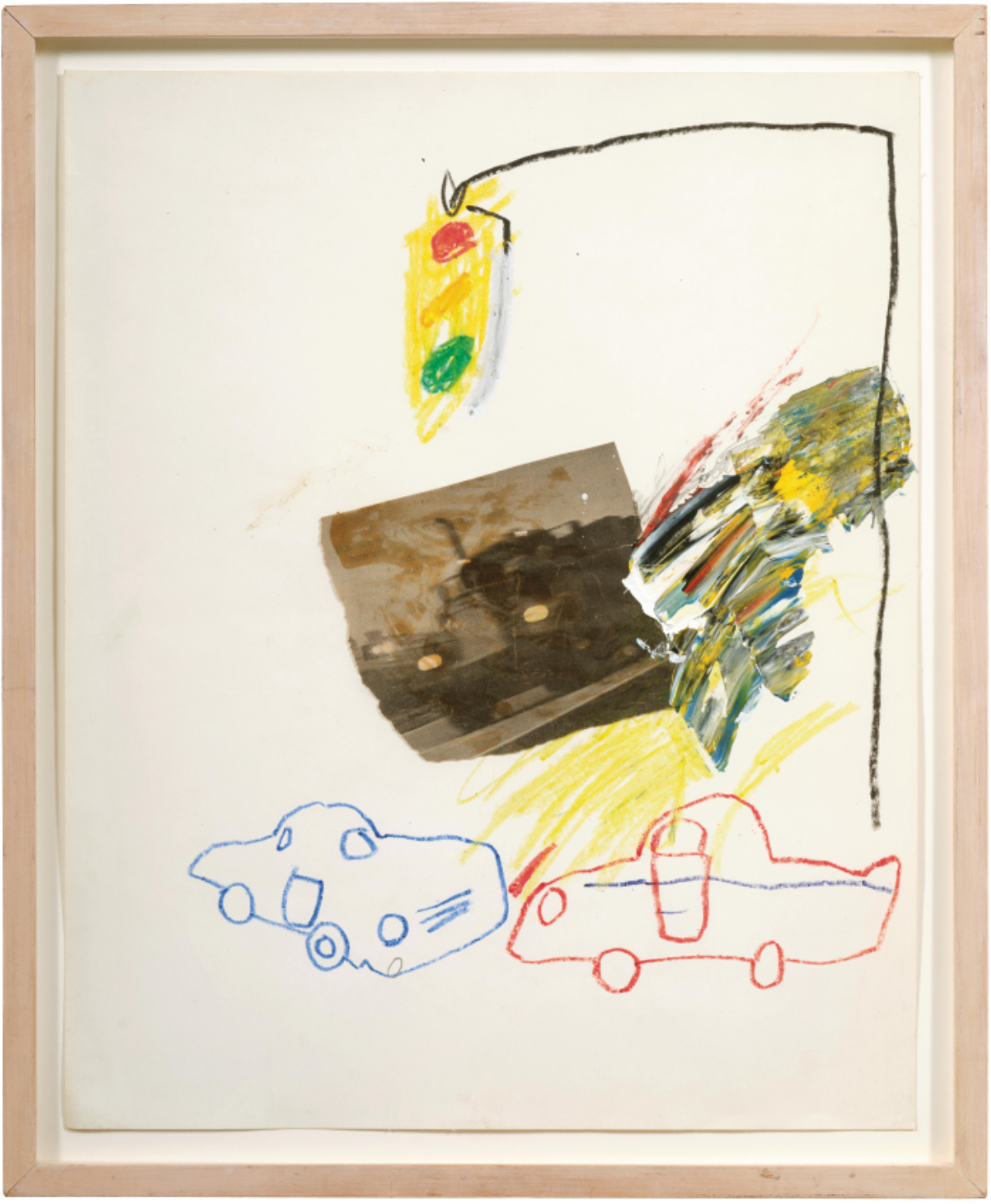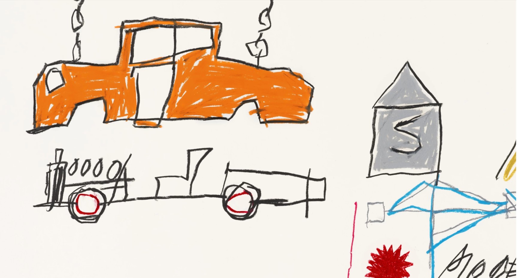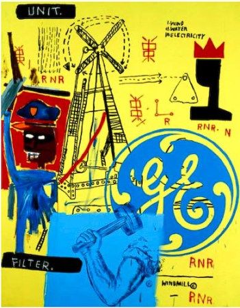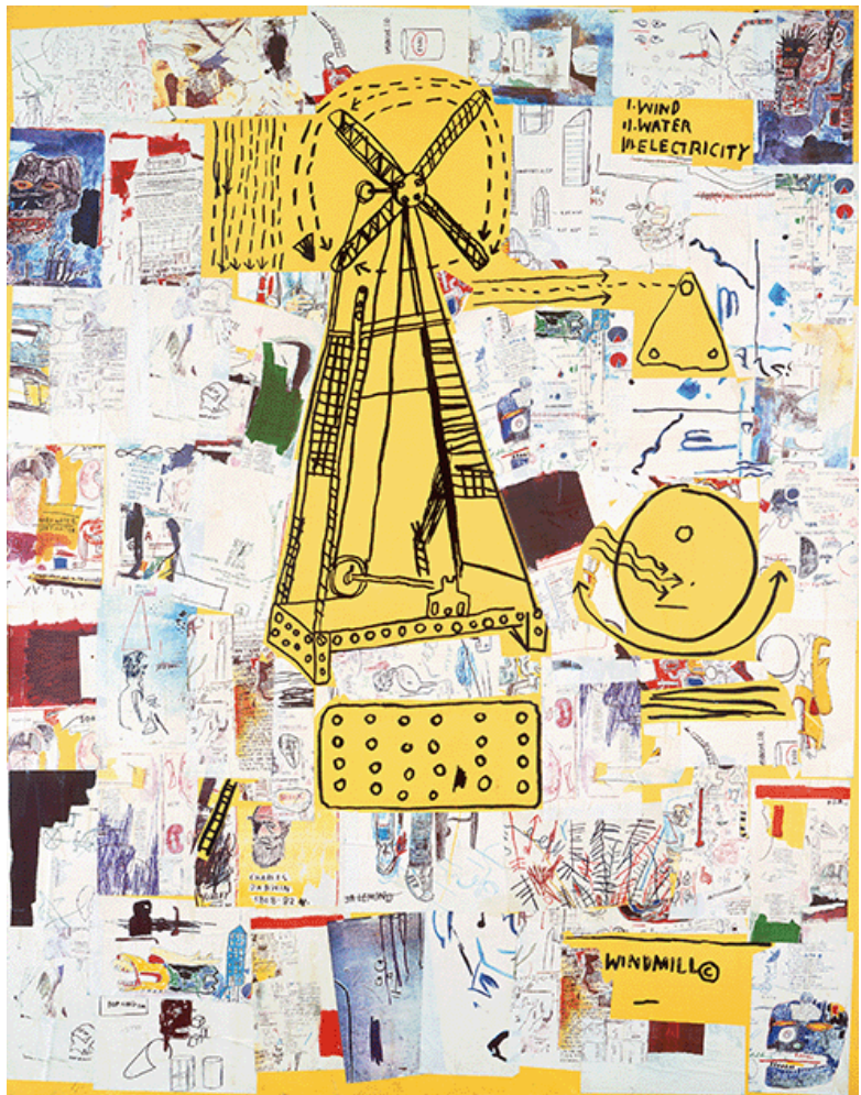 Windmill proved to be an important piece of work for Basquiat because it forms the basis for two large-format paintings. The first, Unit Filter GE, is key example of the works Basquiat created in collaboration with Andy Warhol at the suggestion of Bruno Bischofberger. Windmill is reproduced on an astringent yellow ground, overpainted with Basquiat’s capped figure on the left and black bust adorned with the artist’s iconic three-pointed crown. In the centre, Warhol’s contribution is a salute to his legacy as the founder of Pop Art with a pristine rendering of the logos of two ubiquitous American brands, General Electric and Arm and Hammer. In QUIJ from 1985, Basquiat revisited Windmill alone, this time making the drawing centre stage, encircled by colour Xerox prints depicting of careful selection of his earlier pictures. The work exemplifies a more retrospective moment in the artist’s career, as Basquiat could reflect on the stratospheric success of the early 80s and in which Windmill plays a central role.