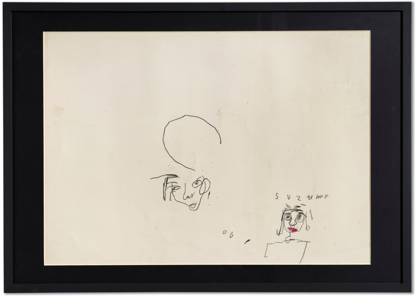Though Basquiat never strayed into the realm of the overtly political in his art, he was eternally conscious of his black identity within a white dominated art-world, and the subject of racial (in)equality nonetheless became an unequivocal focus of his creative vision. By presenting the two figures in this way and making explicit their racial distinctions, Basquiat directly confronts and brings to light the disparate conditions of the two races at the time. A vibrant symphony of densely layered motifs and symbols, the present work showcases the sheer range of Basquiat’s visual language in his works on paper. Brilliantly formulated in the artist’s innovative mind and then translated onto the paper, the drawing is as vivid and alive now as it was at the moment of its execution.