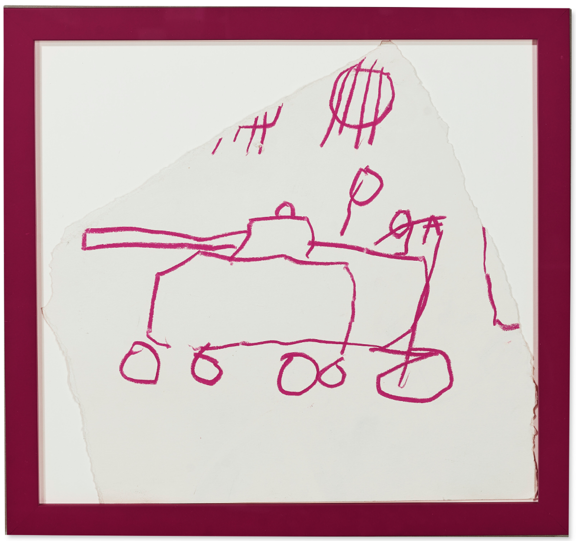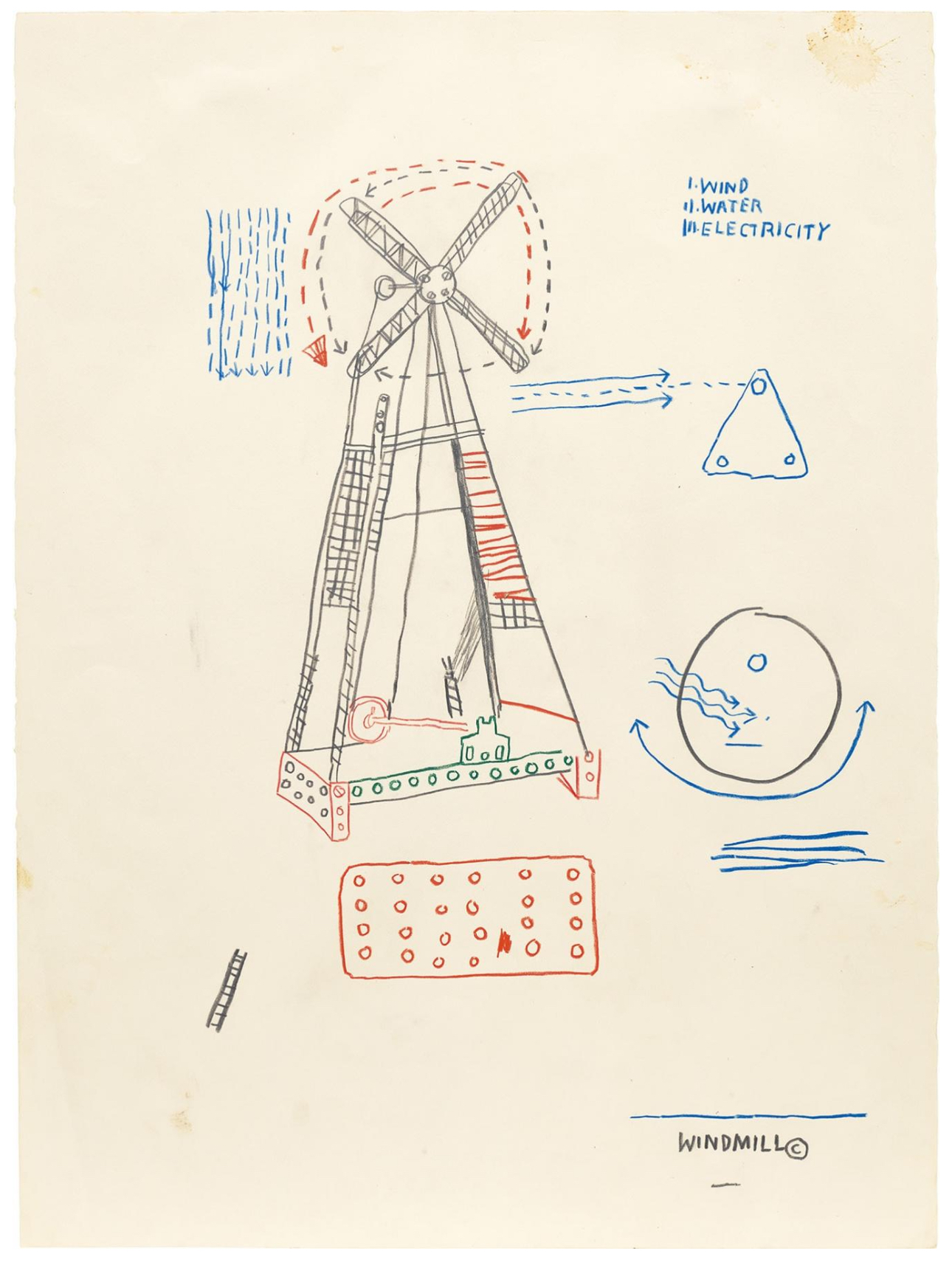 Offered at auction for the first time in more than thirty years, Windmill (1985) is a fascinating example of the artist’s practice. The tri-tonal drawing, rendered in oilstick and graphite depicts Basquiat’s interpretation of the mechanical workings of a windmill, alongside annotations verging on the whimsical. At first glance, the structure recalls an engineer’s blueprint with red and black outlines denoting the supports and moving components. These are overwritten with dotted lines and arrows which seemingly represent wind direction and the additions of further abstract diagrams and the inscription to the upper right corner reading ‘WIND WATER ELECTRICITY.’ Basquiat’s playful approach to symbolism is apparent in the artist’s inclusion of arrows which meet at opposing angles, the packet of pills and the tilted ladder in the lower half of the work. These additions strongly hint at a coded meaning but leave it just out of the viewer’s grasp.