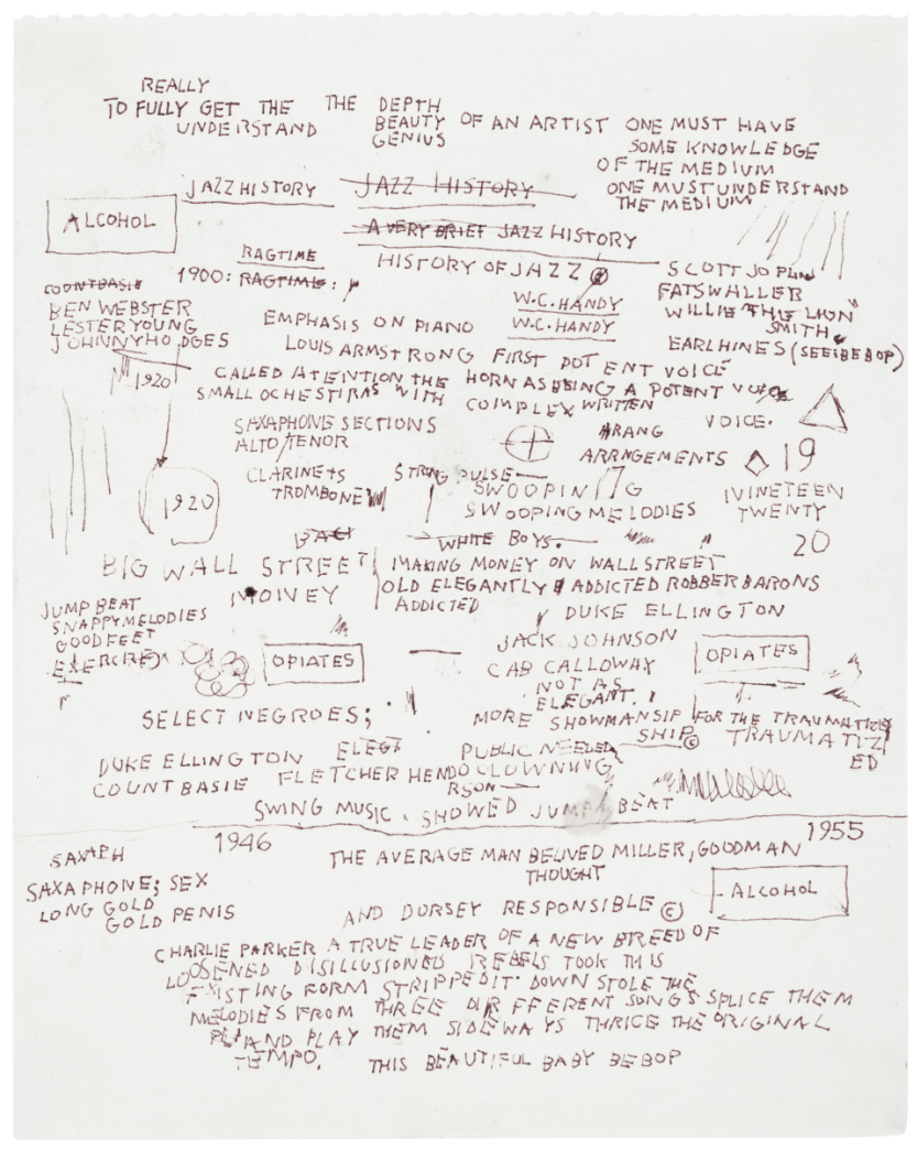 Basquiat filled notebooks with sketches, poems, lists, wordplay, and observations: material that ranges from street life and pop culture to race, class, and history. Those pages aren’t just ephemera; they are the studio in miniature, where themes are tested and sharpened before (or instead of) migrating elsewhere. The institutional validation is explicit: major exhibitions have centered the notebooks themselves, presenting them as primary documents of the work. Paper also enabled a different kind of intimacy. Many sheets feel like direct transmissions: fast, physical, sometimes rough in a way that is not “unfinished” but intentionally unfiltered. Recent curatorial narratives lean into that privacy: showing groups of drawings that Basquiat kept during his lifetime, where the urgency is less performative and more internal.