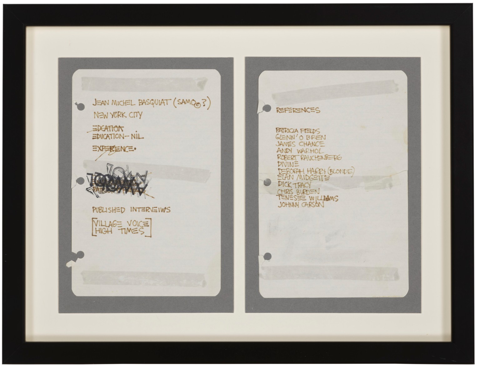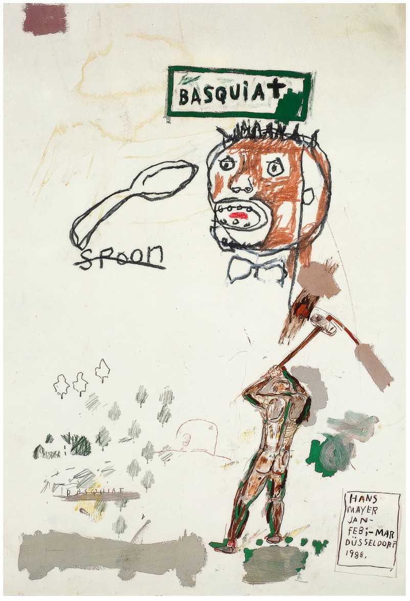 Basquiat’s complex self-images run like a golden thread through his practice. The artist was just twenty when he shed the pseudonymous street tag ‘SAMO’, and took his place at the forefront of the New York art world. Within a year of his breakout exhibition at MoMA P.S.1, he had rocketed to international acclaim. In 1982 he was the youngest artist to exhibit at Documenta VII in Kassel; in 1985, he was hailed as the face of contemporary art on the cover of The New York Times Magazine. His self-portraits confronted his own spiraling mythology, casting himself by turns as hero and martyr. At times he aligned himself with the greats: the athletes, musicians and other icons he admired. The spoon in the present work might be seen to nod to the centuries-old ‘spoonful’ trope, a metaphor for pleasure, explored by blues songsters from Charley Patton to Howlin’ Wolf, Etta James and others. Elsewhere, Basquiat painted himself in crowns of thorns, riffing on Christian iconography. In one canvas, he famously scrawled the words ‘Most young kings get their heads cut off’.