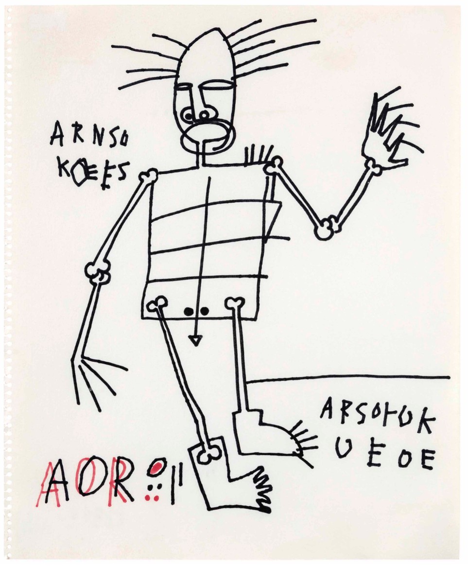 As his mother would recall, Basquiat drew from an early age, always carrying a notebook with him and allowing ‘impressions, thoughts, memories, associations, fantasies, and observations formulating in his mind to simply pass through him, making their way onto a sheet of paper. Immediate and intuitive, his approach to drawing as a mode of ‘channelling’ information – cultural history, politics, snatches of literary and art history, mythology, and music – was established early on and confirmed these works on paper as a distinct and hugely significant part of his practice that can be read independently of his paintings, even while it obviously informed them. In its pictographic arrangements and lively combination of image, symbol, and text, Untitled (Colored Boy Piano Player) exemplifies this ‘channelling’ practice as the artist ‘ate up every image, every word, every bit of data that appeared in front of him and he processed it all into a bebop cubist pop art cartoon gospel that synthesised the whole overload we lived under into something that made an astonishing new sense. Proud of his self-taught credentials, Basquiat devoured books, from Gray’s Anatomy to The Philosophy of Andy Warhol (From A to B and Back Again), The Bible to the Encyclopaedia Brittanica, writing these references and the processes of thinking them through into his densely citational paintings and drawings. In the present work, the repetition of certain symbols and phrases refers directly to Basquiat’s close reading of Henry Dreyfus’ 1972 semiotic study Symbol Sourcebook: An Authoritative Guide to International Graphic Symbols. A compendium of the graphic language of symbols, that includes the more familiar visible language of street signage and instructional codes designed to be immediately legible, regardless of the viewer’s language or level of literacy (a child recognizes the danger of a skull and cross bones sign on an everyday domestic cleaning fluid), to more esoteric symbolic systems.