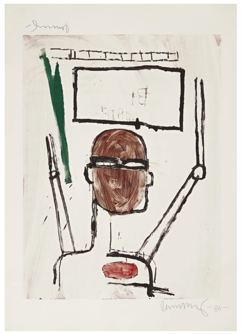 Beneath his name, written over by hand, Basquiat has daubed his own image, rendered with visceral vitality of his early oilstick heads. He is clad in a bow tie: an art world star ready to receive his public. At the same time, his head is gaunt and skull-like, eyes glaring and mouth wide open. A spoon, laden with untold meaning, hovers before him, the word struck through in conflicted doubt. Basquiat painted self-portraits throughout his oeuvre, grappling repeatedly with the force of his own legend. In Riding with Death, the Eroica paintings and others of 1988, the twenty-seven-year-old artist began to picture his own mortality. Like the late self-portraits of Picasso, Van Gogh and Warhol, the present work weaves heroism and fatalism into a poignant reminder of life’s fragility.