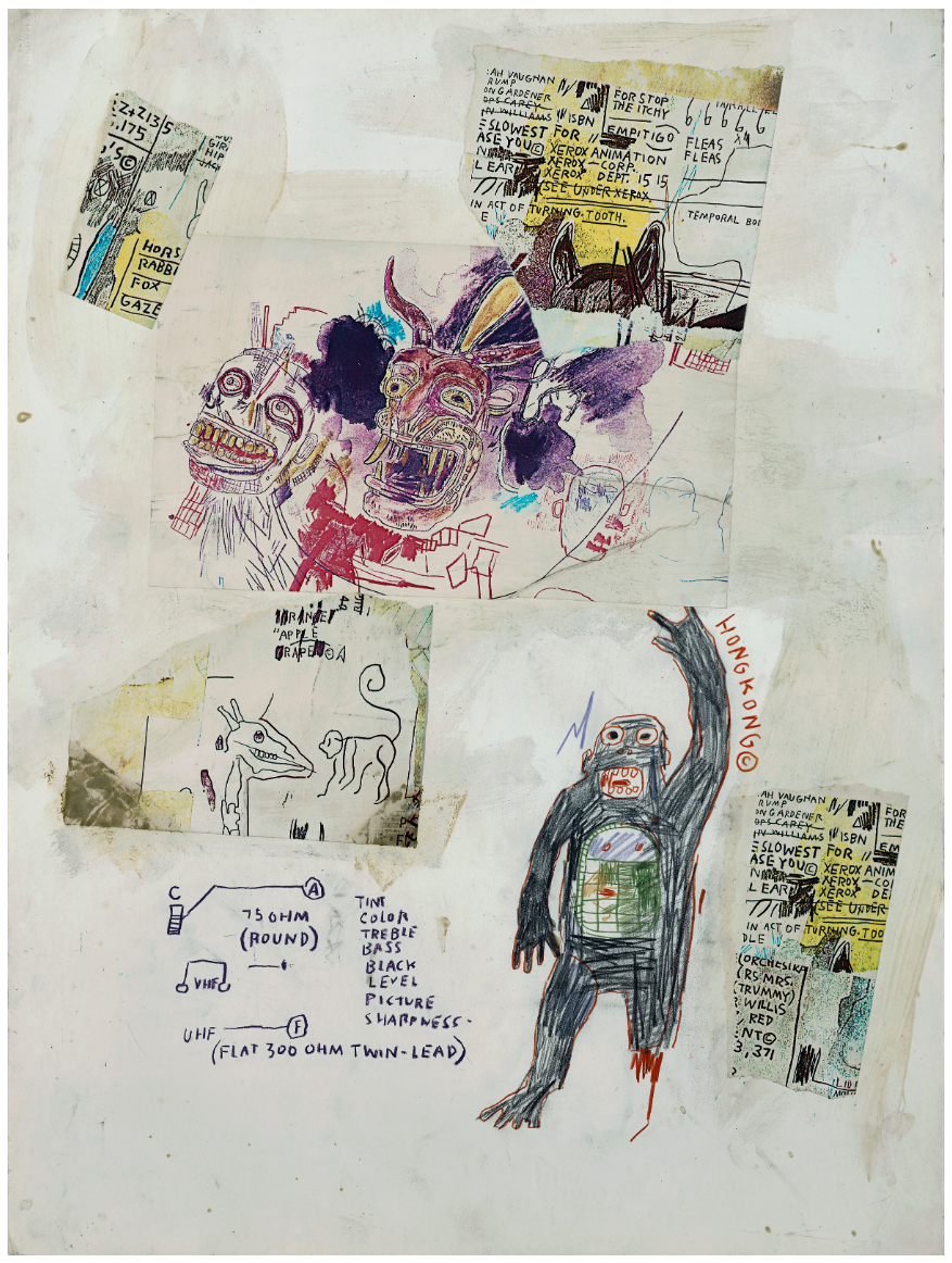 The 1980s was the golden age for Hong Kong film and Cantopop, and Basquiat was very likely to have experienced parts of it during the two-week visit. In the lower left corner of Hong Kong, the artist scribbled references of mass culture: the unreadable electronic circuit symbols, a series of words, like treble, picture, and sharpness, that associate with TV user manual, as well as the acronyms “UHF” and “VHF” that can be identified with radio, which was the main music streaming site back then. Chow recounted in an interview about the trip and this work, “he always picked up local culture… he recorded everything with his drawings, and Hong Kong was somewhere that was very exotic for him, so he automatically picked these objects.”