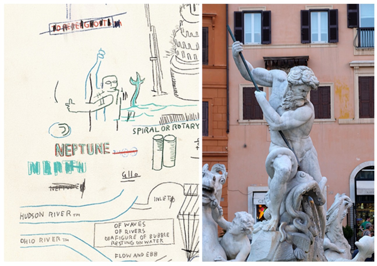In Untitled, detailed renderings of the throat and jaw highlight Basquiat’s stream-of-consciousness style—a careful balance of urgency and coherence. While anatomically investigative, the work also autobiographically surveys Basquiat’s oeuvre, referencing pieces such as the Brooklyn Museum’s Back of the Neck, 1983; Horn Players, 1983, at the Broad, Los Angeles; Jawbone of an Ass, 1982; and Monticello, 1986. Shared across these are themes of deconstructed anatomy, Black musicians, and biblical references. In Jawbone of an Ass, the title derives from Samson’s legendary feat—a gesture of strength and divine favor—reflecting Basquiat’s engagement with spiritual and mythological content. Here, Neptune is also depicted, identified by the label “NEPTUNE” and a figure with classical attributes, reinforcing mythic themes.