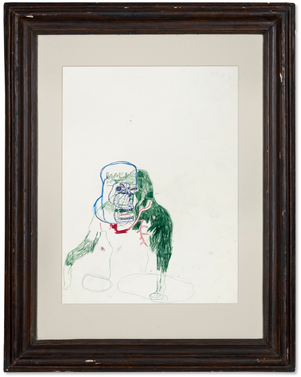 The present drawing represents a confident assertion of Basquiat’s draftsmanship and instinctive storytelling. The frenetic energy in his works on paper, evident in Untitled, differs from that of his paintings—here, expression is immediate, raw, and intense. Drawing was Basquiat’s most direct mode of translating his thoughts. Evocative of Cy Twombly—whom he admired—Basquiat’s marks suggest a proto-handwriting, an elusive language suspended between legibility and pure symbolism. Through recursive anatomy, television, history, and Black culture, Basquiat constructed a symbolic system all his own.