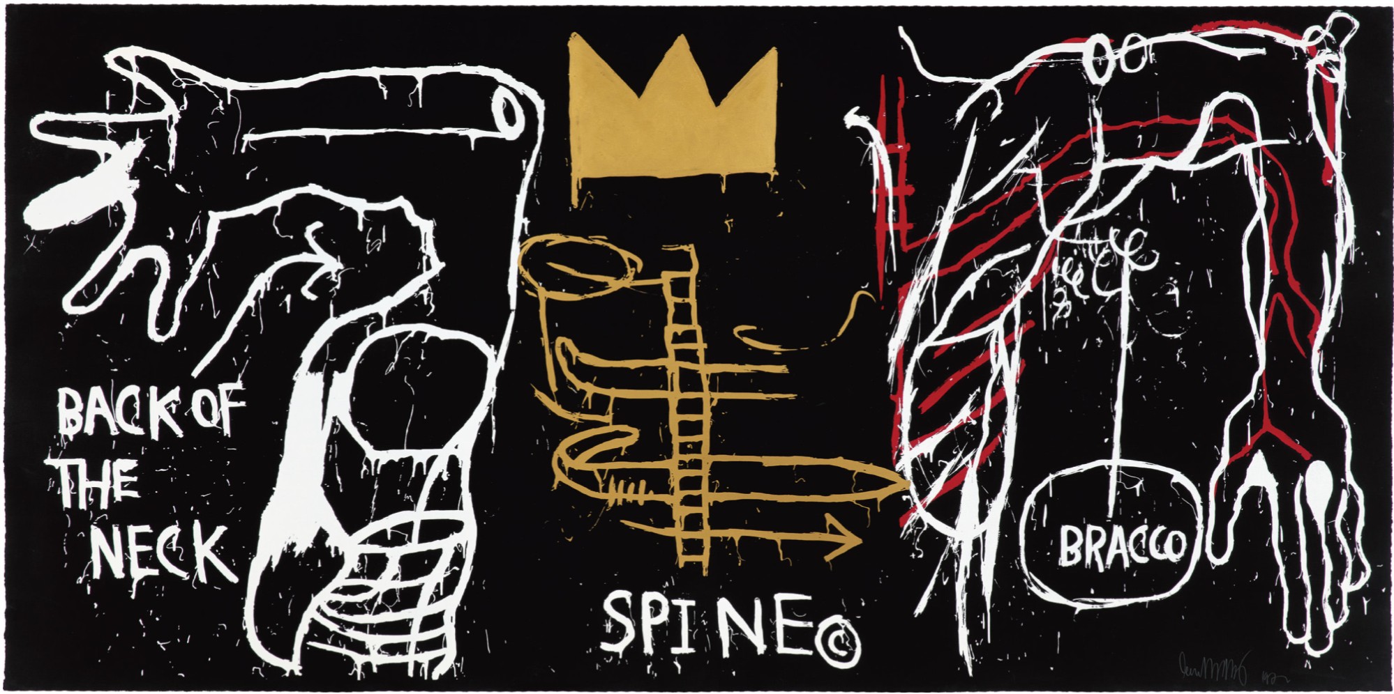 Executed in 1983 and part of a rare and monumental screen print edition by Jean-Michel Basquiat, Back of the Neck is replete with the artist’s hallmark iconography. One of only a handful of editioned screenprints produced by the artist in his lifetime, Back of the Neck brims with the dazzling graphic force of Basquiat’s obsession with anatomical imagery. In harmony with each other, ardent bodily sketches, the three-pointed crown, the copyright symbol and Basquiat’s idiosyncratic handwriting are here emblazoned across a monumental picture plane. Utterly epitomising Basquiat’s iconography, a work from the very same edition is housed in the permanent collection of The Brooklyn Museum, New York, while another example was included in the Guggenheim’s landmark exhibition Basquiat’s ‘Defacement’: The Untold Story in 2019.