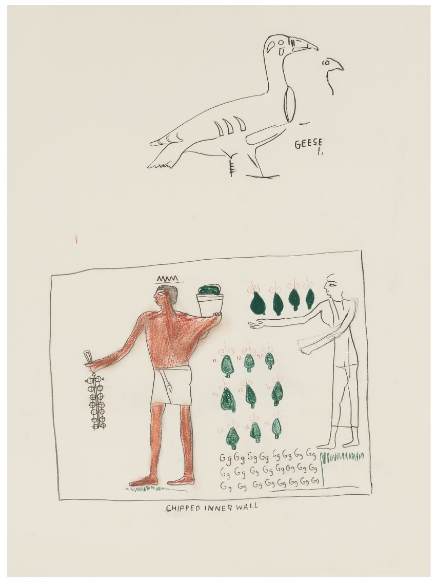 In bringing this coded visual language into his practice, Basquiat honors this sophisticated mode of visual communication, and the powerful ways in which it allowed the most unseen and ignored members of society to forge their own communities and remain visible to one another. Closely connected to Basquiat’s reference to the nomadic Blemyan tribe in the eastern Sahara in his inclusion of ‘Dumaris’ in a number of significant compositions, we might also read these pictograms as Basquiat’s ‘affirmation of his own nomadic journey’, his dedication to choosing his own path, connecting and communicating with fellow travellers along the way.