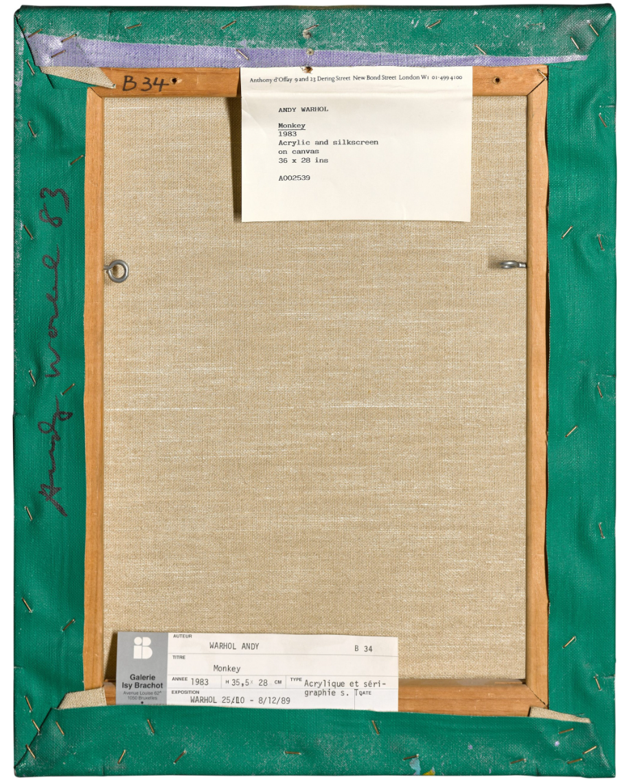 Pop Art unequivocally revolutionized art’s purview by challenging traditional subject matter in order to give artistic form to the pillars of modern consumer society: news, celebrity, advertising, and products. As the pioneer of this movement, Andy Warhol deftly traversed all four of these image fields with his legendary silkscreen paintings. In the present vibrant Monkey from 1983, Warhol elevates an emblem of consumerism, in this case a toy monkey, to the realm of high art and in doing so exposes the artistry and power of the carefully crafted symbols themselves. In his use of recognizable graphics, Warhol extends upon Marcel Duchamp’s legacy of the readymade, and remixes cultural signifiers for his own aesthetic ends. Imbued with an inherent dynamism, the small-scale paintings in particular celebrate childhood delight.