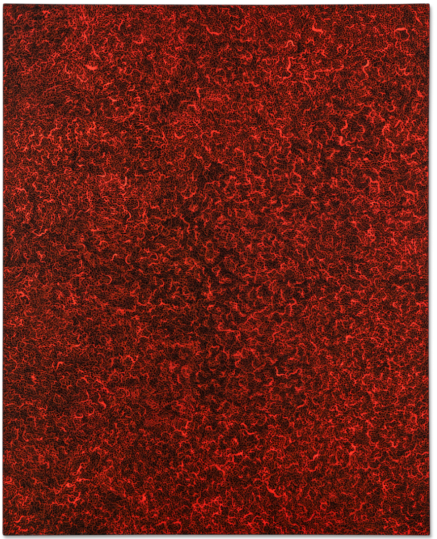 The scintillatingly complex surface of The Sea in the Evening Glow (B) Facing the Imminent Death is seemingly quintessential Yayoi Kusama, yet there is a singularity reverberating from the dizzying crimson picture plane. Executed in 1990, the present work emerges as a profound extension of Kusama’s renowned Infinity Net series, adjacent in its repetitive and obsessive rendering of lines that never connect. This marked a pivotal time in which Kusama embraced acrylic paint, a medium that allowed her to explore and highlight contrasting hues with greater fluidity and precision.