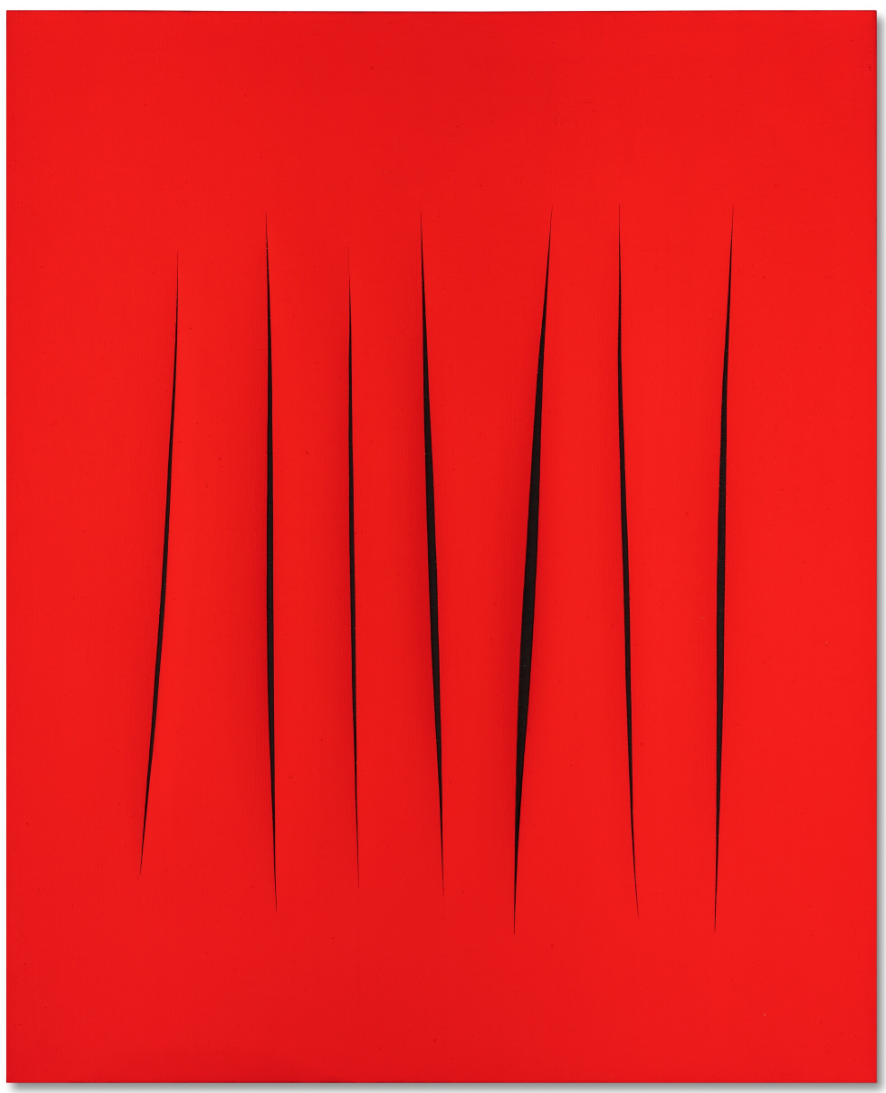 A window to a celestial realm beyond the cosmos, Lucio Fontana’s Concetto spaziale, attese from 1966 is an exemplar of the artist’s tagli series: genre-defining action paintings globally recognized to have shaped the cultural canon of western art history with immeasurable magnitude. Slashed, perforated, and passionately performative with a palpable vitality, seven exquisitely executed slashes disrupt a homogenous red picture plane. Rendered in the most powerful of pigments, this sensuous scarlet painting alludes to passion, danger, violence, and lust, while simultaneously signaling an alternate reality: a sublime spatio-temporal investigation that sought to understand man’s physical and philosophical positioning in the universe, which until then was uncharted and boundless.