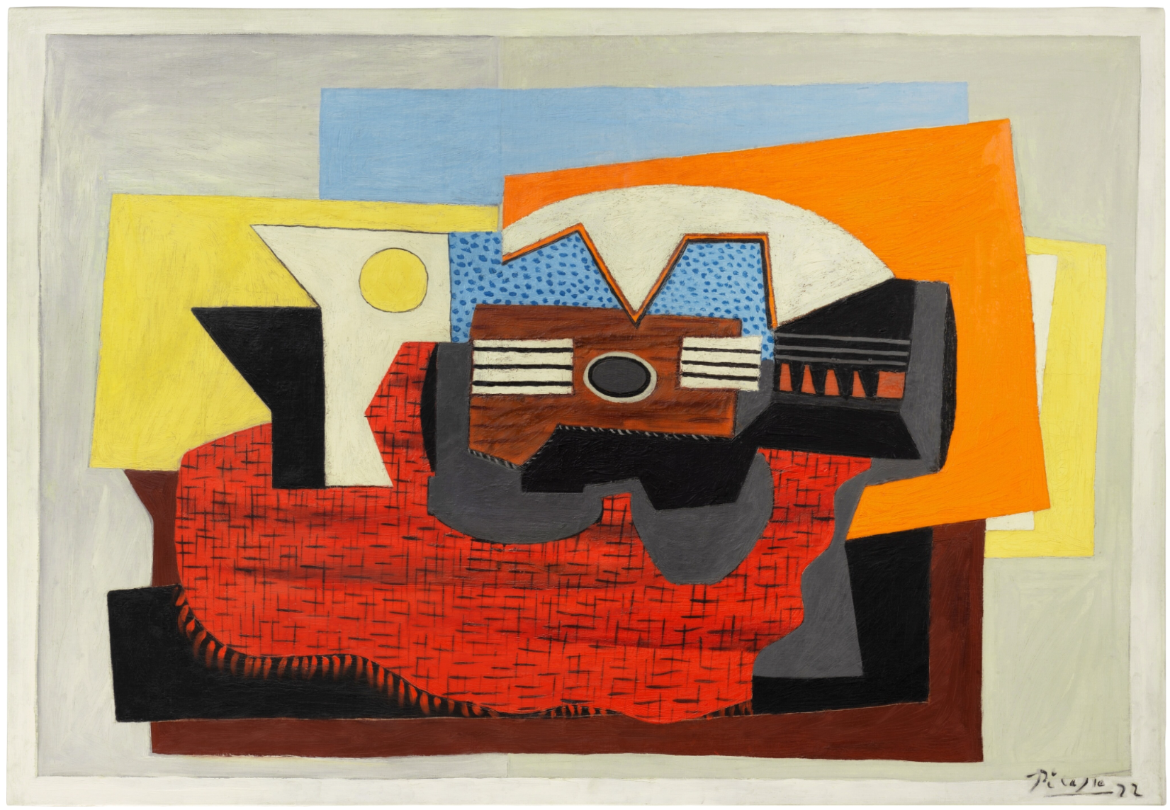 In particular, Palau i Fabre observes how although depth is eradicated in favor of rigid two-dimensionality, the naturalistic nature of some of these flat elements force the eye to establish perspective. In the present work this is realized through the red rug which is placed under the guitar and achieves the effect of transforming the entirely flat yellow and orange forms behind into a table top. It is this kind of formal experiment that reveals Picasso’s Cubist work of the 1920s to be not so much the final act of the twentieth century’s greatest artistic movement, but the clear and confident expression of a new visual language and one that he would continue to explore for much of the rest of his life.