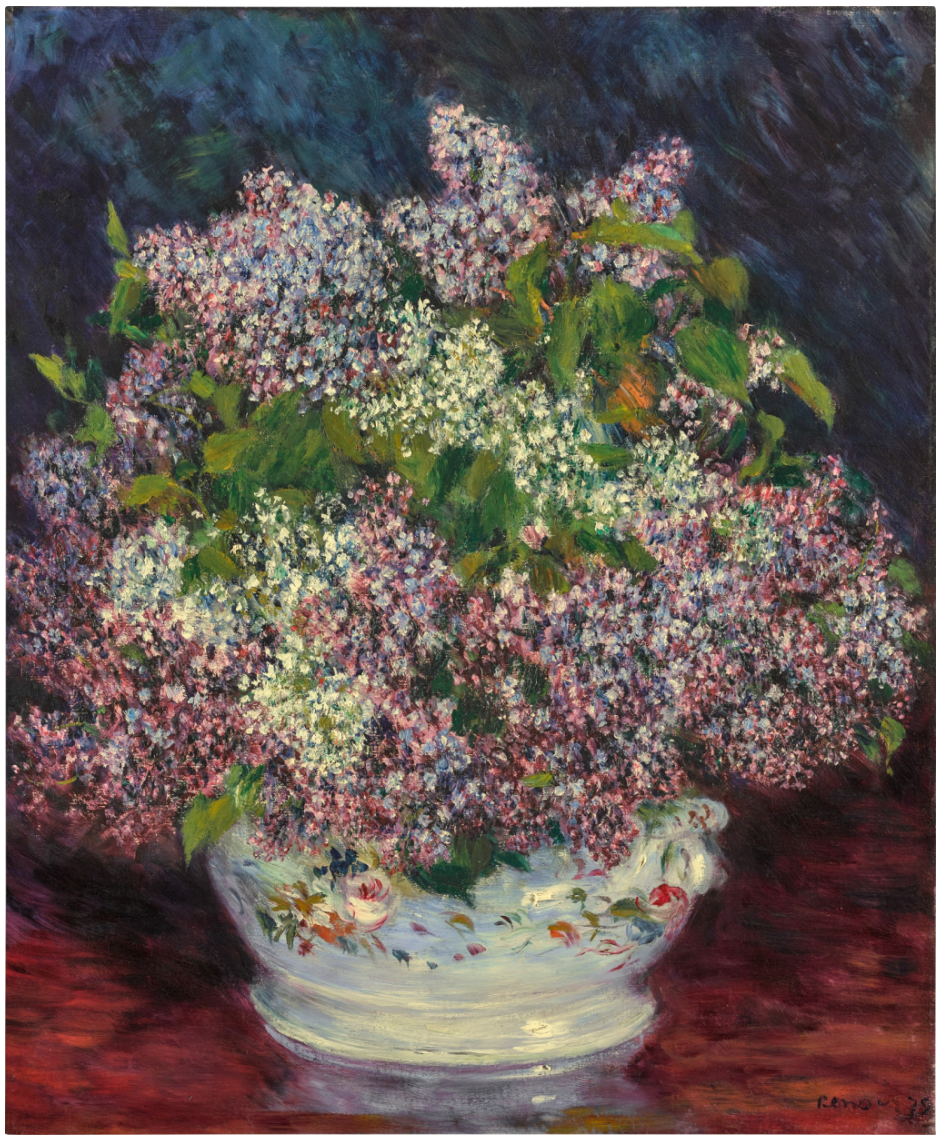 In Bouquet de lilas Renoir manages to strike a perfect balance between technical virtuosity and bold experimentation. The way the artist depicts the luscious bunch of lilacs is incredibly intricate. Each flower is jewel-like in its execution, with Renoir paying close attention to the play of light on their delicate petals and the difference in hue between the budding and in bloom flowers. At the same time, Renoir masterfully captures the atmosphere created by the bouquet in the space it occupies. The lilacs form an airy, cloud-like vision on the surface of the canvas that perfectly conveys the essence of these widely loved, delicately fragrant harbingers of spring.