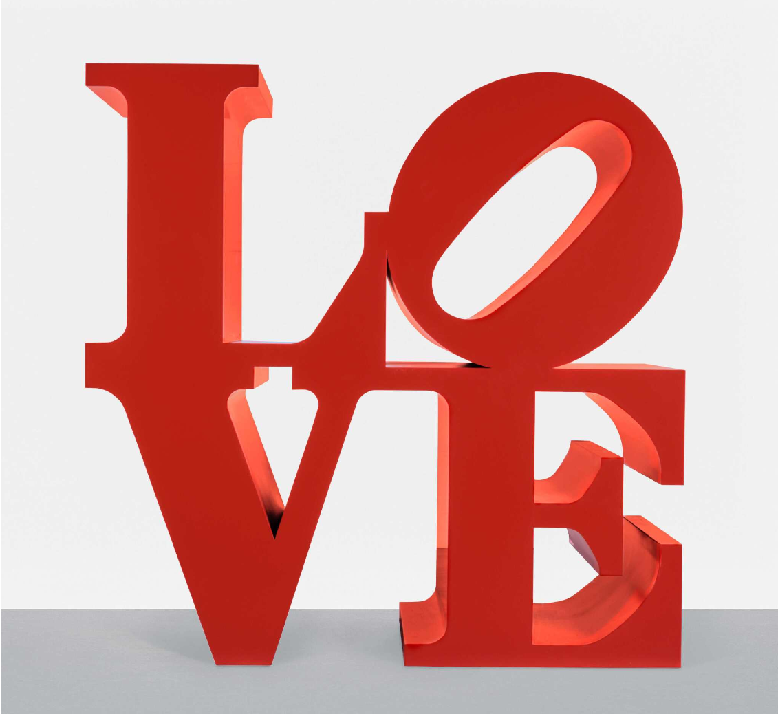 Often looking at commercial signage for inspiration, the present work was inspired by the stenciled lettering seen on the packaging and billboards of Indiana’s childhood. Having spent his early years moving from town to town and spending much of that time on the road, the road-signs of the highways left a lasting impression on the artist. Looking at the ways graphic letters and numbers acquire beauty as shapes and silhouettes when separated from their meaning, LOVE brings to focus the weight, balance and shape of each letter as they are neatly stacked on top of each other in a bold topographical design. The expressive red is used here not just for its symbolic association with love and passion but, when combined with Indiana’s typeface, graphic design and simplified stacked format, to communicate the universal emotion tied to a single word in an immediate and direct way, becoming an icon of contemporary art in the process.