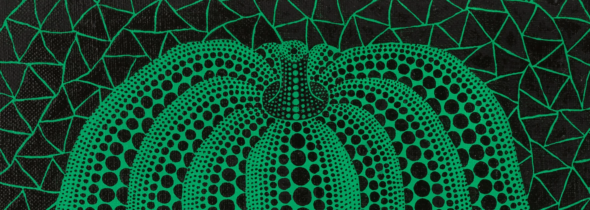 Pumpkin (TWX) presents a green and black rendition of Kusama’s iconic pumpkins. Developed to mature perfection through decades of near-obsessive production and reproduction, each of these distinct elements reflect a different segment within Kusama’s expansive aesthetic philosophy whilst coming together to create a dazzlingly hypnotic visual narrative – one that evokes strong associations with the formal reduction of Minimalism, the repetitive symbolism of Pop and the hypnotic illusions of Op Art. Surreal and fantastical, Kusama’s pumpkin paintings exhibit extraordinary dexterity in skill and execution as well as the single-minded meticulous vision that defines the artist’s career – all the while being deeply personal and indexical, representing a wholly epic extension of Kusama’s legacy in contemporary art and culture.